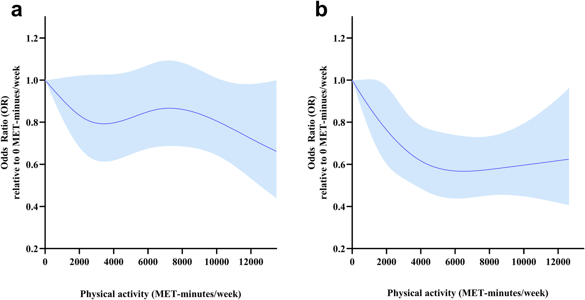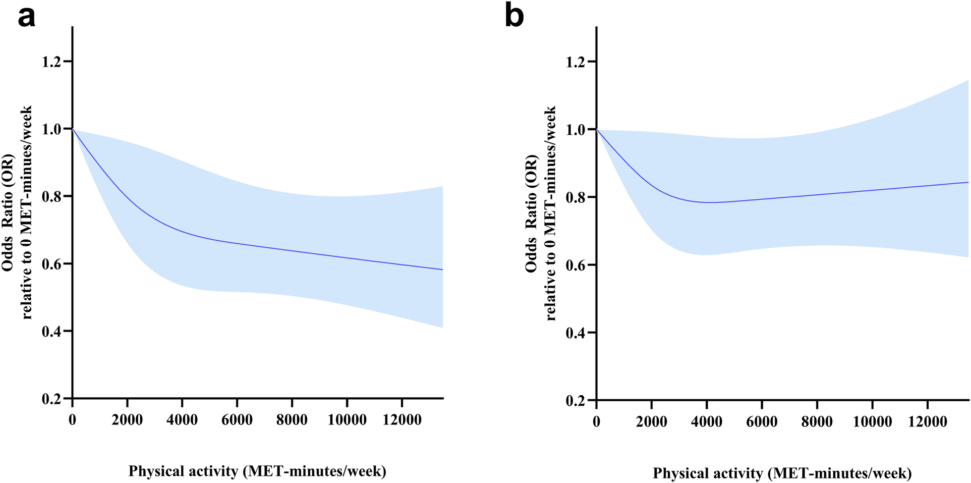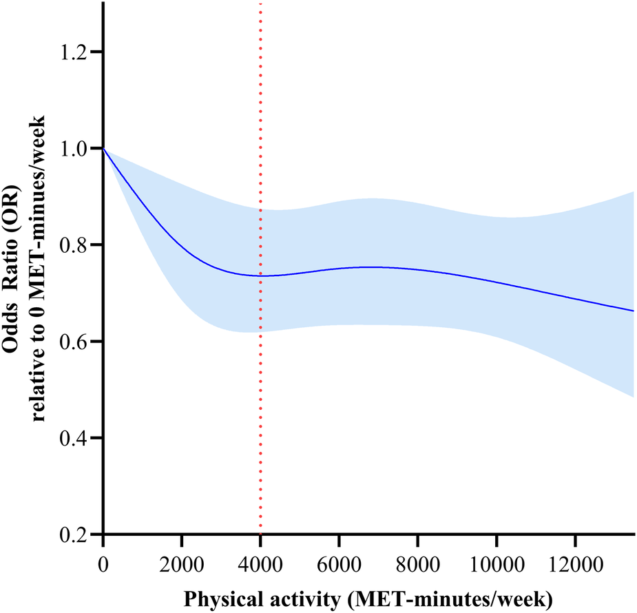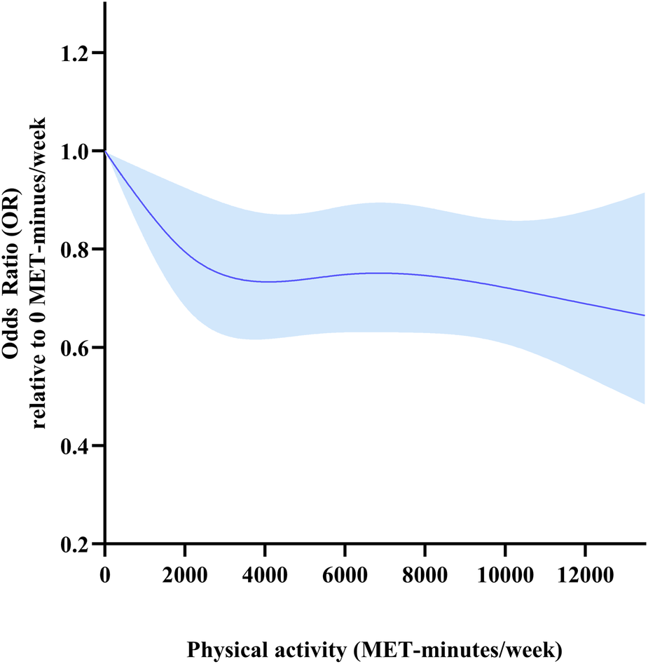 Compared to the least active participants, a low risk of HD was significantly associated with a higher PA volume. With regards to frequency, a lower HD risk was associated with performing vigorous PA except for 3–5 days/week. The frequency and duration of light as well as moderate PA had no significant associations with HD risk after adjusted by using covariates. A non-linear association was also noted, with increased PA being associated with decreased HD risk, with steeper reductions in HD risk at low activity levels than at high activity levels. There was a non-linear association between PA and HD risk in participants in male and aged older than 65 years.