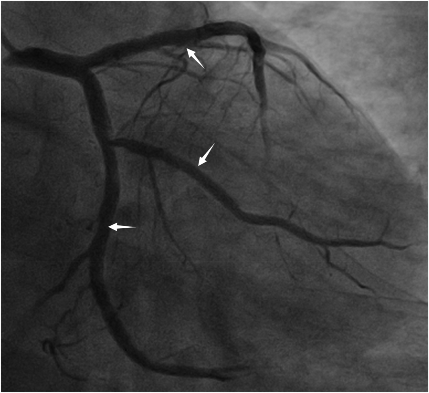 The original stents in the LAD, LCX, and OM are patent (red arrow indicates the LAD stents, white arrow indicates the OM stent, black arrow indicates the LCX stent).
