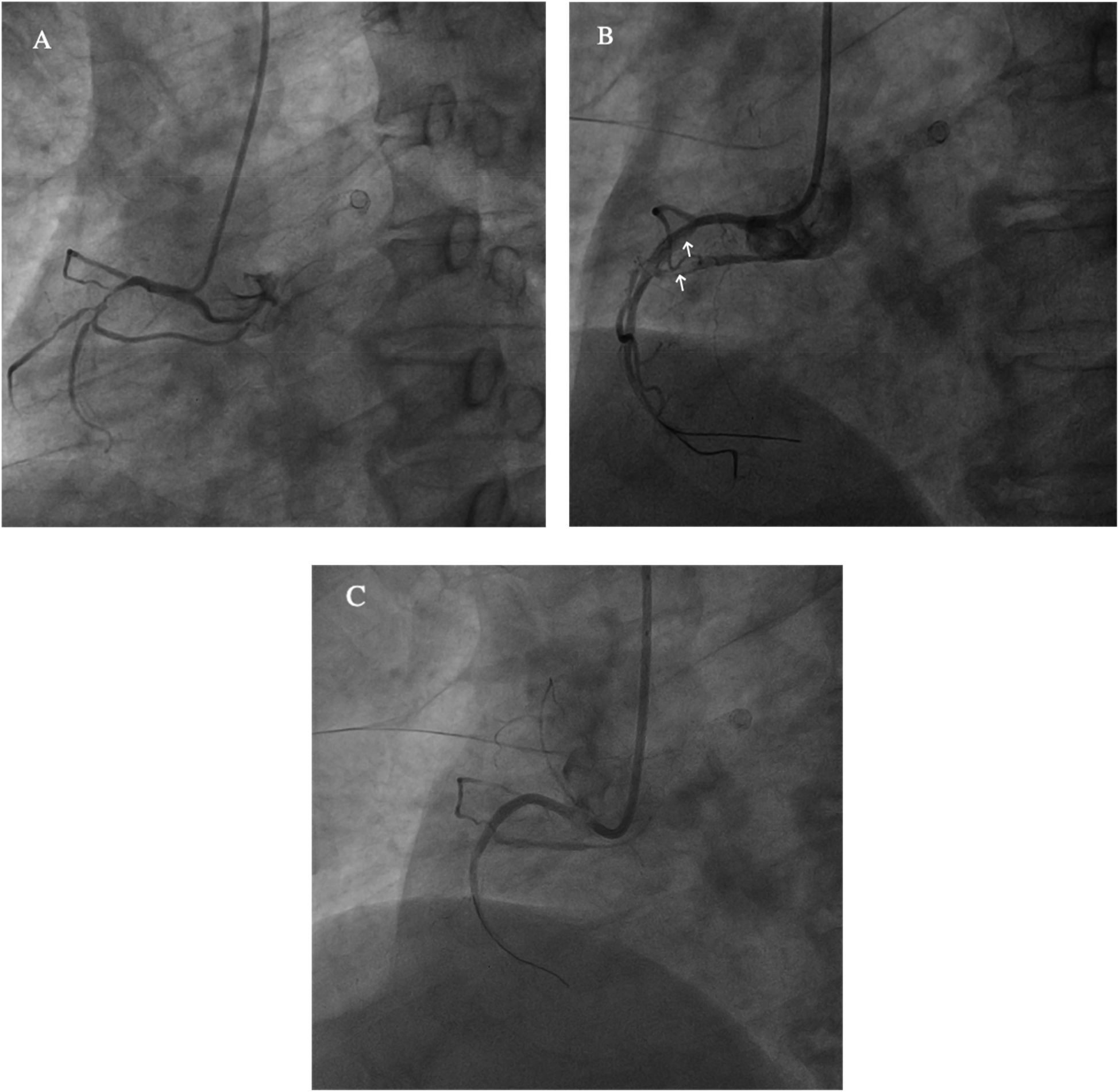 (A) The right coronary artery (RCA) is short and severely narrowed in the proximal segment. (B) After drug balloon dilation, coronary artery dissection is observed (white arrow). (C) Post-stent implantation, the stent is well-expanded, with TIMI III flow.