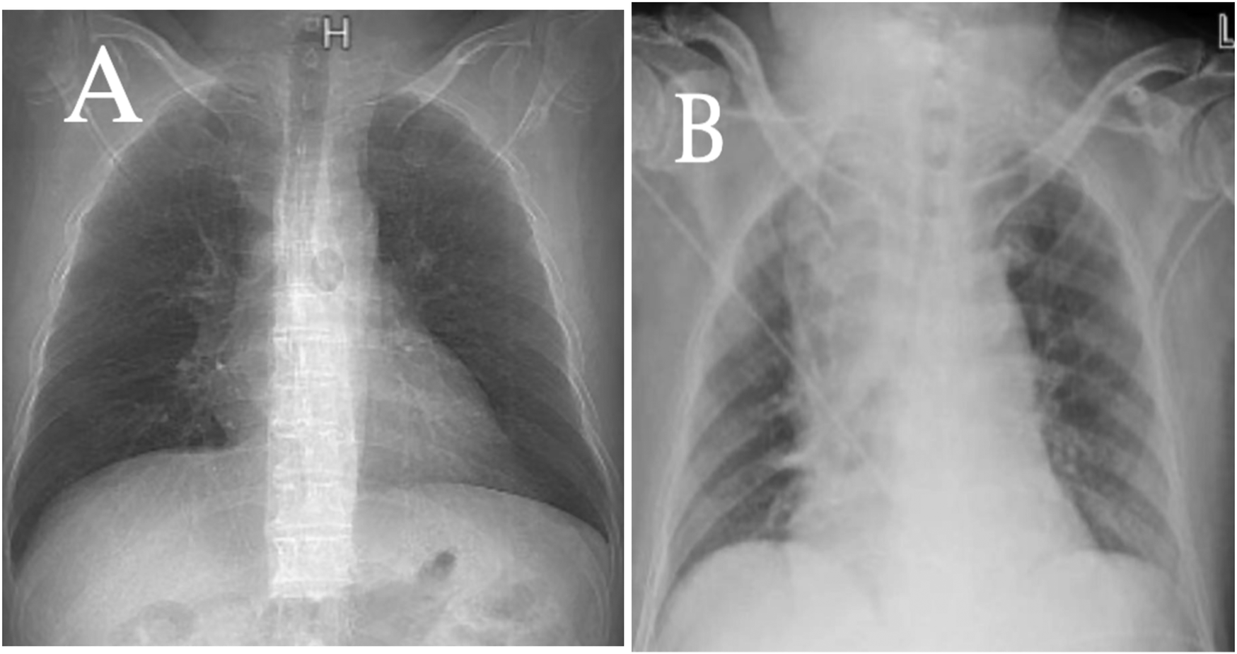 A comparison of chest x-rays taken the day before surgery (A) and on the day of surgery (B) shows a significant widening of the mediastinum in (B).