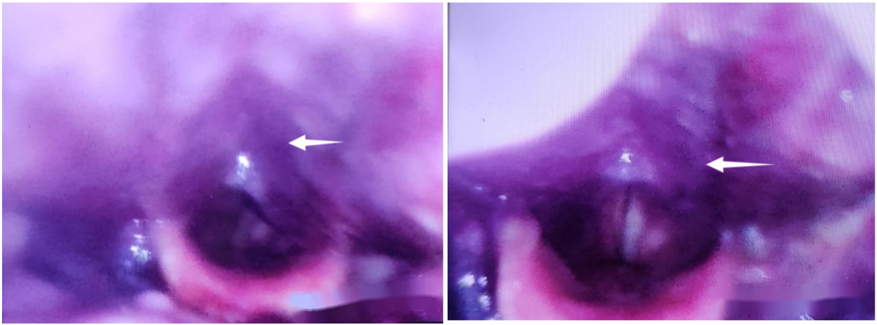 On the second day postoperatively, recurrence of symptoms, with electronic laryngoscopy revealing swelling of the pharyngeal wall accompanied by bluish discoloration.