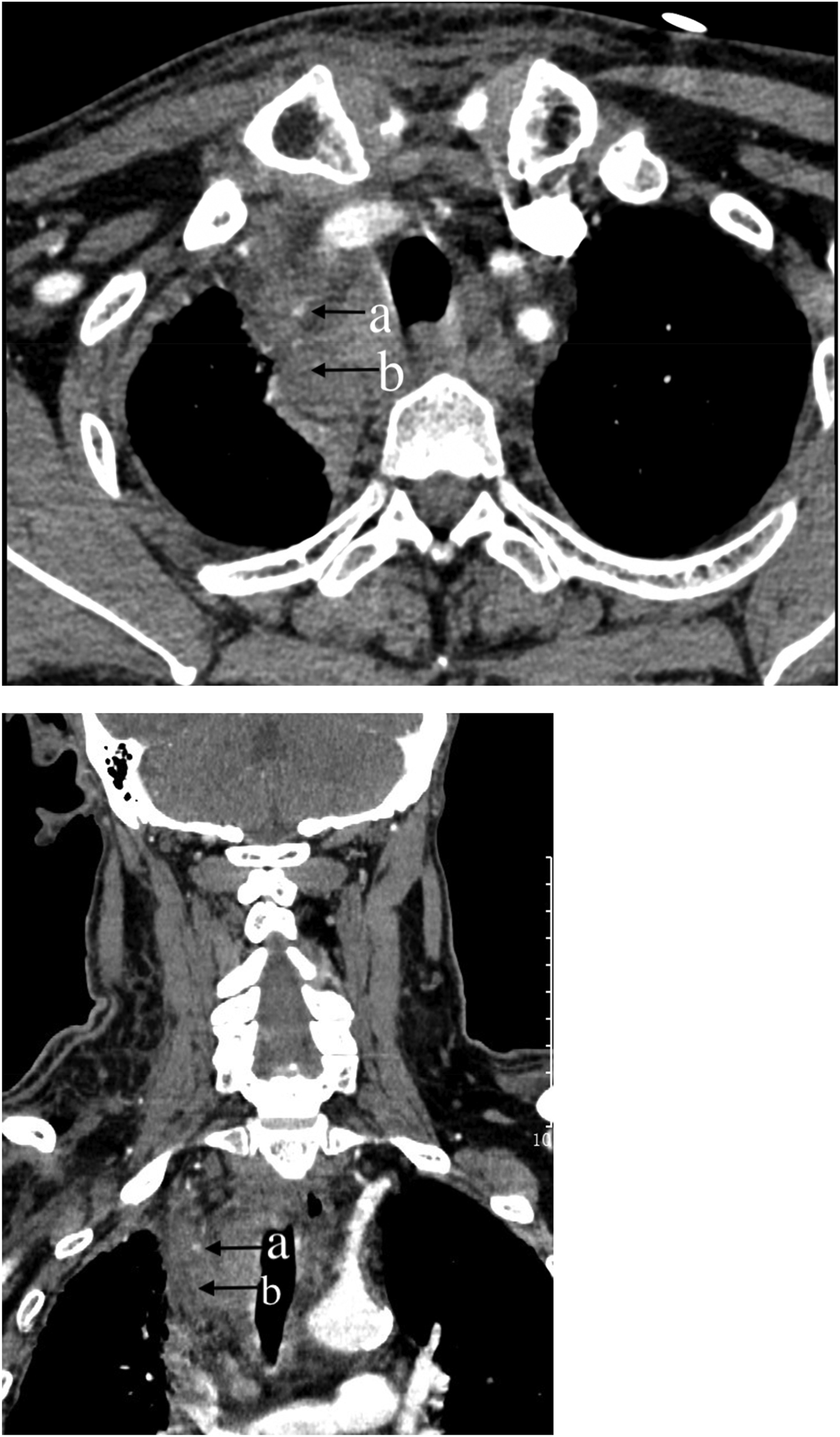 Chest computer tomography (CT) scan of the neck and chest: (a) Dot-like enhancement in the arterial phase, indicating active bleeding. (b) Mediastinal hematoma.