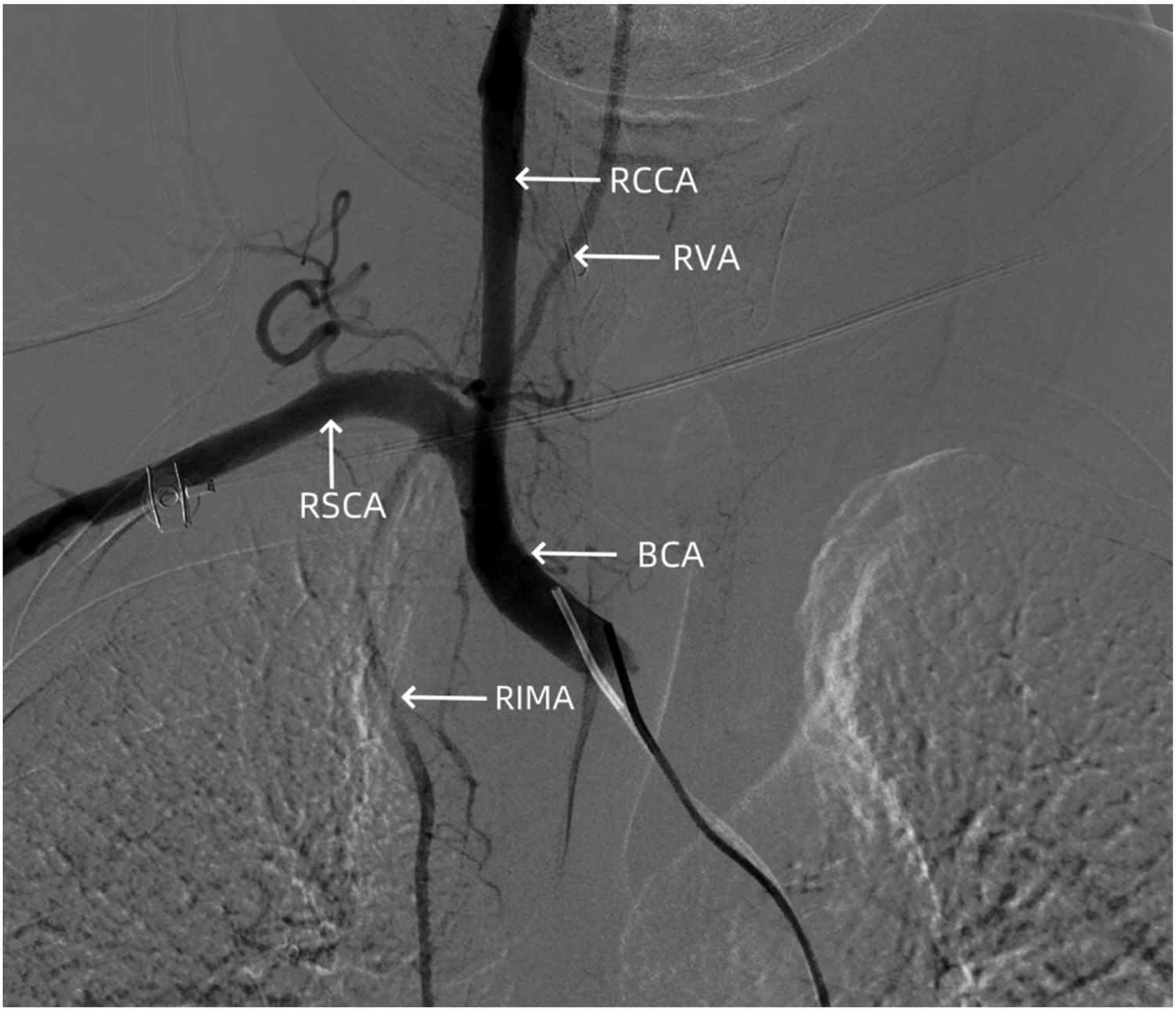 Angiography showing no signs of dissection hematoma or perforation bleeding in the brachiocephalic trunk, cervical internal carotid artery, and subclavian artery. RCCA, right common carotid artery; RVA, right vertebral artery; RSCA, right subclavian artery; BCA, brachiocephalic artery; RIMA, right internal mammary artery.