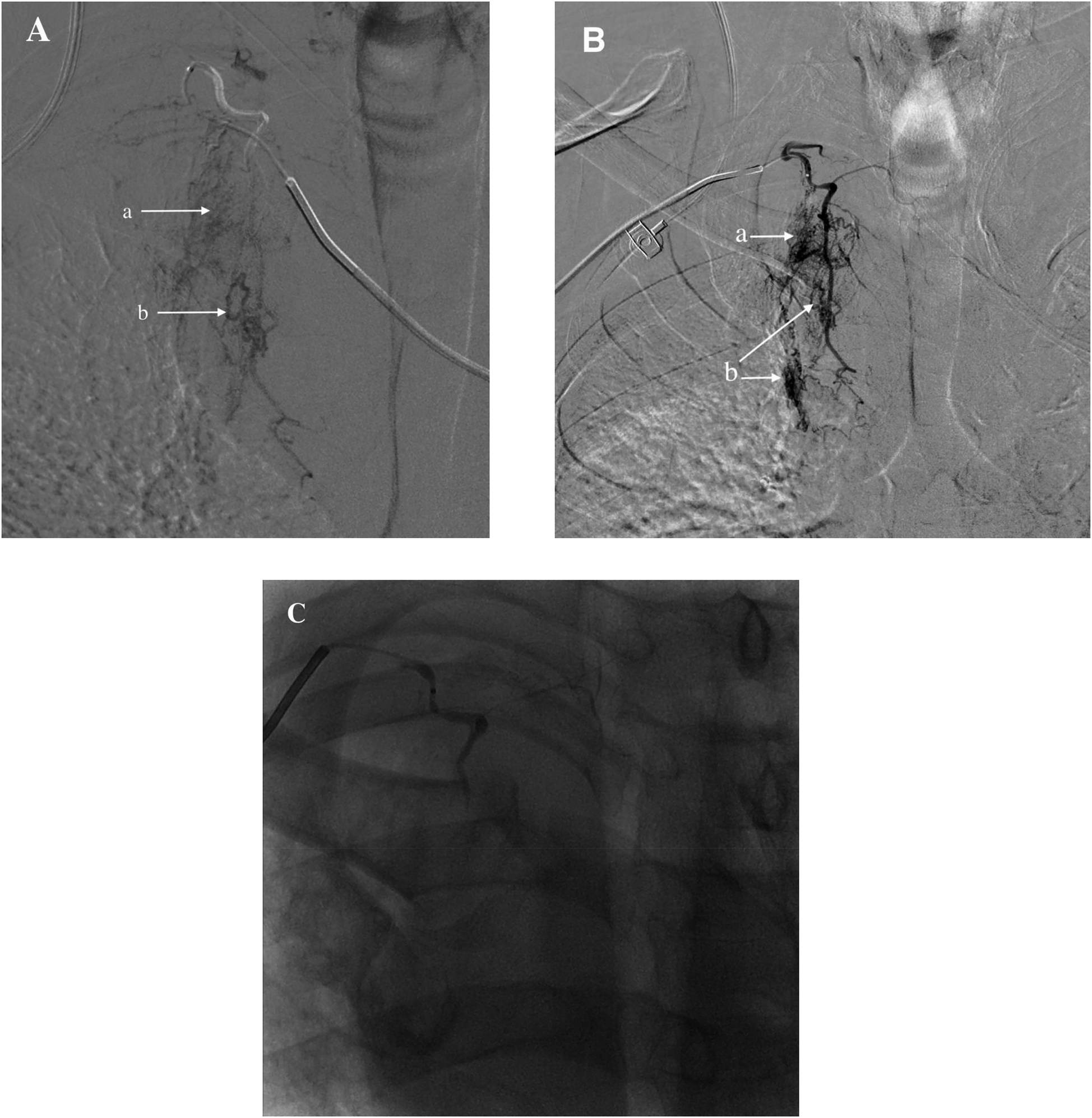 (A) Identified responsible artery via the femoral artery route, but catheter fixation was not possible. (B) Identified responsible artery via the right radial artery route. (C) Completion of embolization. (a) Diffuse extravasation of contrast agent indicating bleeding. (b) Shunt to systemic pulmonary artery.