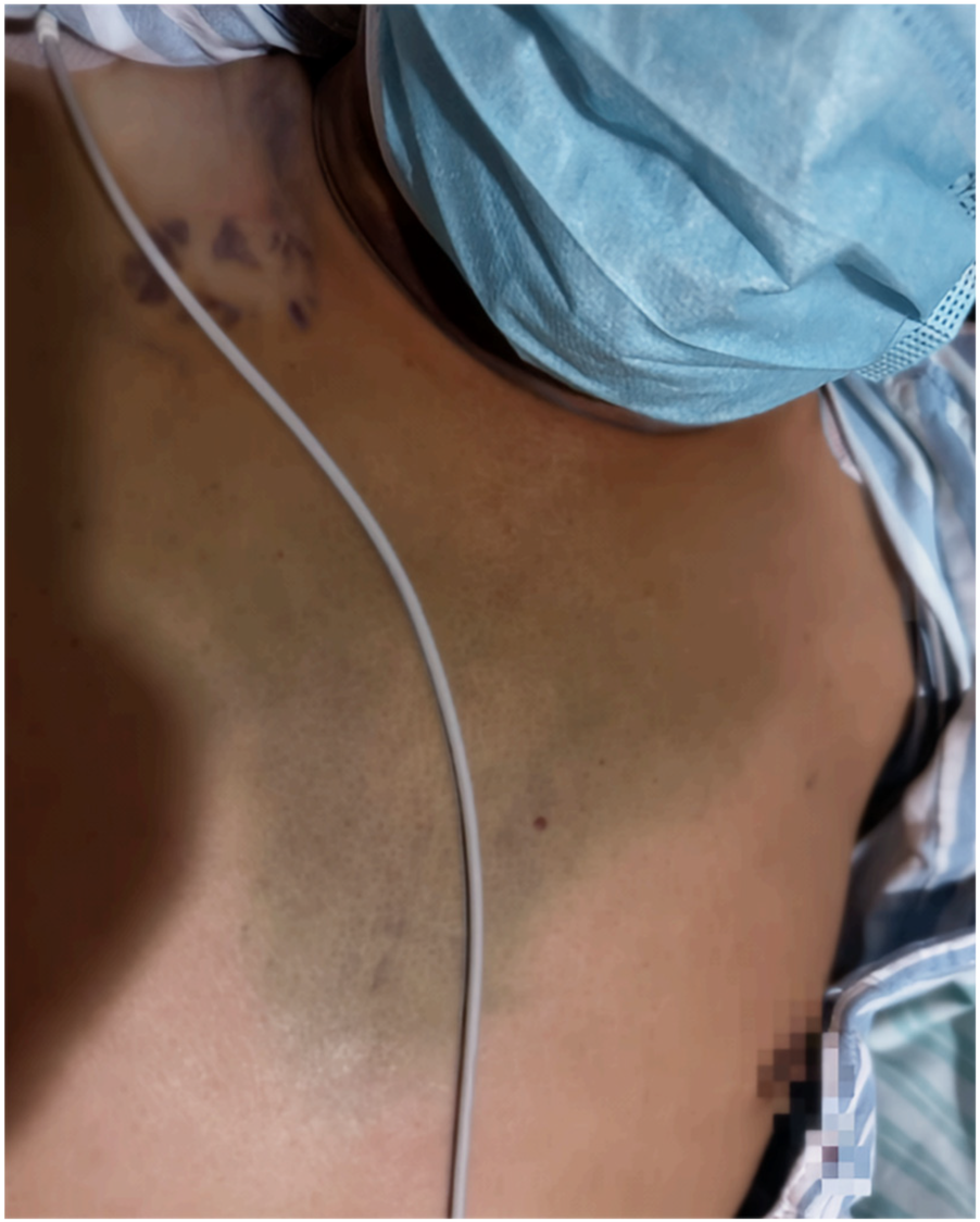Following the procedure, aspirin was immediately discontinued, and the patient was treated with clopidogrel alone for antiplatelet aggregation. The patient's chest tightness symptoms improved, cough and sputum production did not worsen, but significant throat pain was noted during swallowing, and neck swelling gradually decreased. Bruising was observed in the chest area (Figure 8). Dynamic monitoring of blood routine and chest CT showed a decrease in hemoglobin levels to a minimum of 103 g/L. Chest CT indicated gradual absorption of the mediastinal hematoma with secondary bilateral minimal pleural effusion. C-reactive protein (CRP) levels peaked at 147 mg/L. Symptomatic treatments for cough, sputum, and infection were provided based on the pulmonary condition. On the 7th day post-embolization, aspirin was reintroduced in combination with clopidogrel for dual antiplatelet therapy. A follow-up chest CT on the 13th day post-procedure showed almost complete absorption of the hematoma (Figure 9). The patient was discharged on the 21st day post-procedure. At 2 months post-discharge, the patient remains healthy.