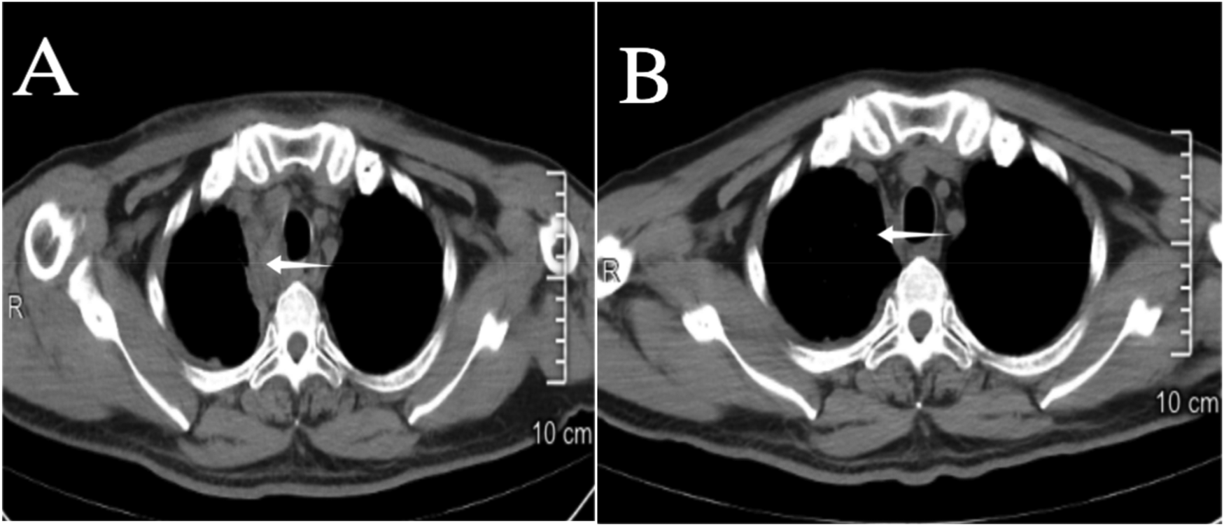 (A) 2nd day post interventional embolization; (B) 12th day post interventional embolization, on the 12th day the mediastinal hematoma (indicated by the arrow ←) is nearly completely absorbed, and airway compression has improved.