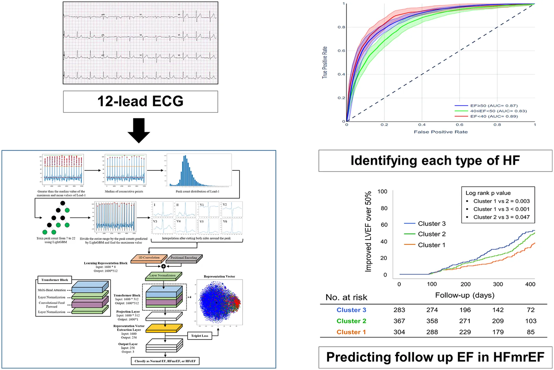We collected 104,336 12-lead ECG datasets from April 2009 to December 2021 in a tertiary centre. The AI-ECG encompasses a novel model that combines an automatic labelling preprocessing method with a transformer architecture incorporating a triplet loss for HFmrEF analysis.