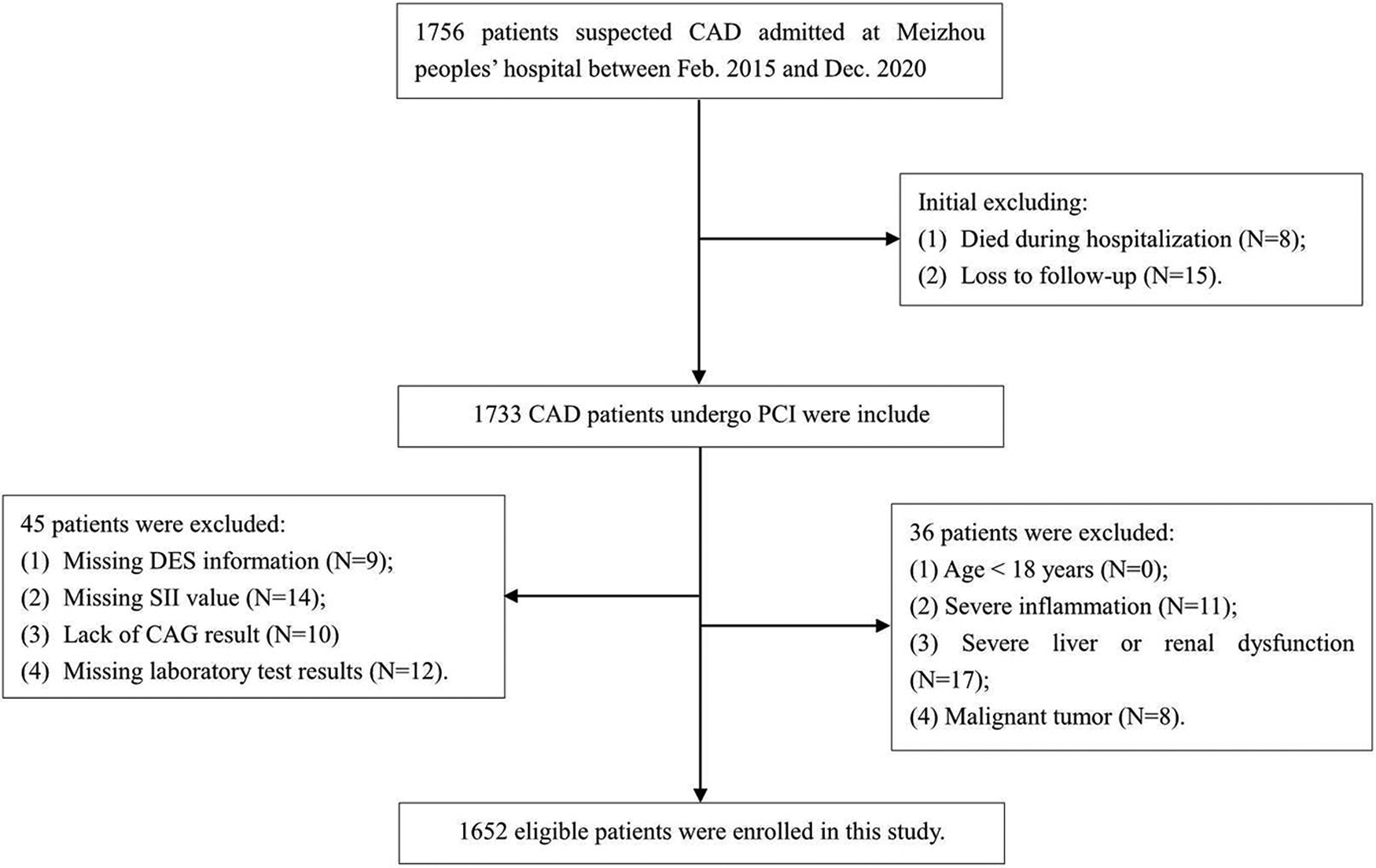 Consecutive patients who were admitted for acute coronary syndrome (ACS) in Meizhou People's Hospital, and underwent follow-up angiography ranging from 3 to 24 months after receiving coronary drug-eluting stents (DES) implantation for the first time, were retrospectively enrolled from February 2015 to December 2020. The diagnosis of ACS was made in line with the criteria specified in the guidelines (28). The protocol of this study adhered to the principles of the Declaration of Helsinki and was authorized by the ethics committee of the institution. Written informed consent was not required as the study was retrospective, and all participant records were anonymized and ensure confidentiality. Participants were selected based on the following requirements: (1) patients with acute coronary syndromes; (2) those receiving DES for the first time at our facility; (3) DES was performed according to the Chinese Guidelines for Percutaneous Coronary Intervention (2016) (29); (4) confirmation of intra-stent restenosis (ISR) via coronary angiography during follow-up; (5) relevant demographic characteristics, laboratory and imaging data are complete and available from the hospital information system. Participants excluded from the studies were those aged below 18 years, individuals with incomplete coronary angiography results, insufficient follow-up data, missing Systemic Immune-Inflammation Index (SII) results, severe hepatic or renal dysfunction, patients with acute or chronic inflammatory diseases, autoimmune diseases, and those with malignancies. The detailed screening process is illustrated in Figure 1. A total of 1652 eligible participants ranging from 26 to 92 years were included in the final cohort, all of which were assessed with 2-year follow-up by angiography after DES implantation. Two cardiologists, each operating autonomously, were charged with analyzing the follow-up angiography results and subsequently assigning the participants to either the group with Intra-Stent Restenosis (ISR) or the group without ISR. Furthermore, we investigated the association between SII levels and ISR across diverse subgroups of ACS patients, categorized based on the degrees of coronary artery lesions: specifically, those with single-coronary artery lesion (n = 177), double-coronary artery lesions (n = 303), and triple-coronary artery lesions (n = 1,172). Parallel analyses were conducted within distinct subgroups according to diabetes, comprising 522 diabetics and 1,130 non-diabetics.