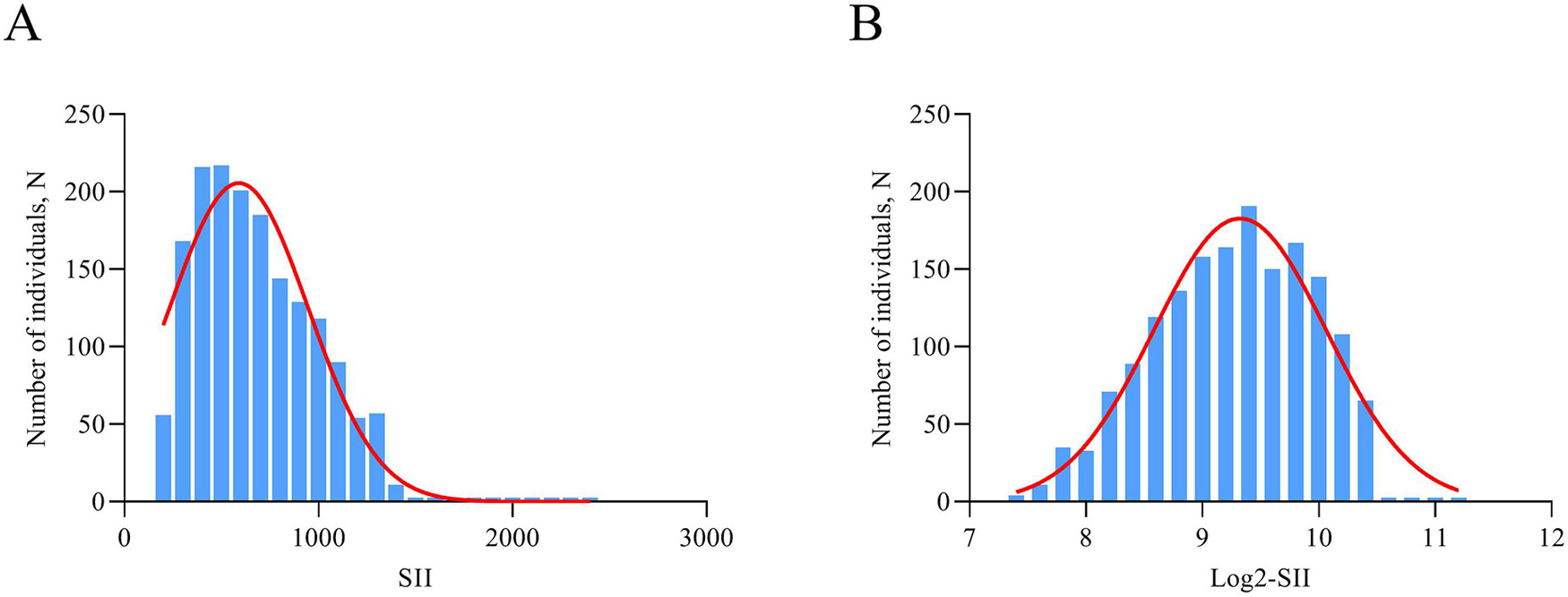 The distribution of SII (A) the distribution of log2-transformed SII (B).