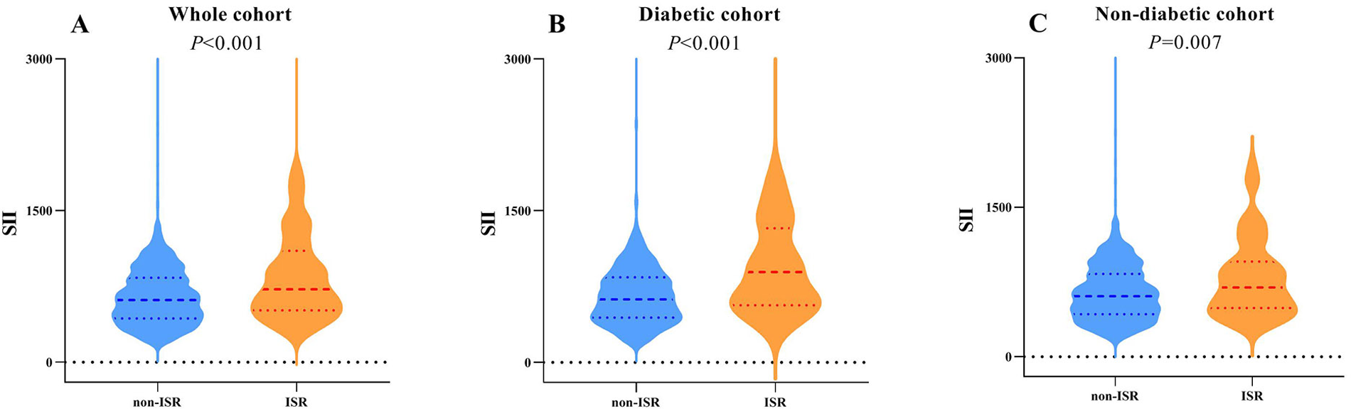 Violin plots of the SII showing the distribution in the non-ISR and ISR groups of the whole cohort (A), diabetic (B) and non-diabetic cohorts (C) the SII of the ISR group was higher than that of the non-ISR group in all above three cohorts (A, P < 0.001; B, P < 0.001; C, P = 0.007, respectively).
