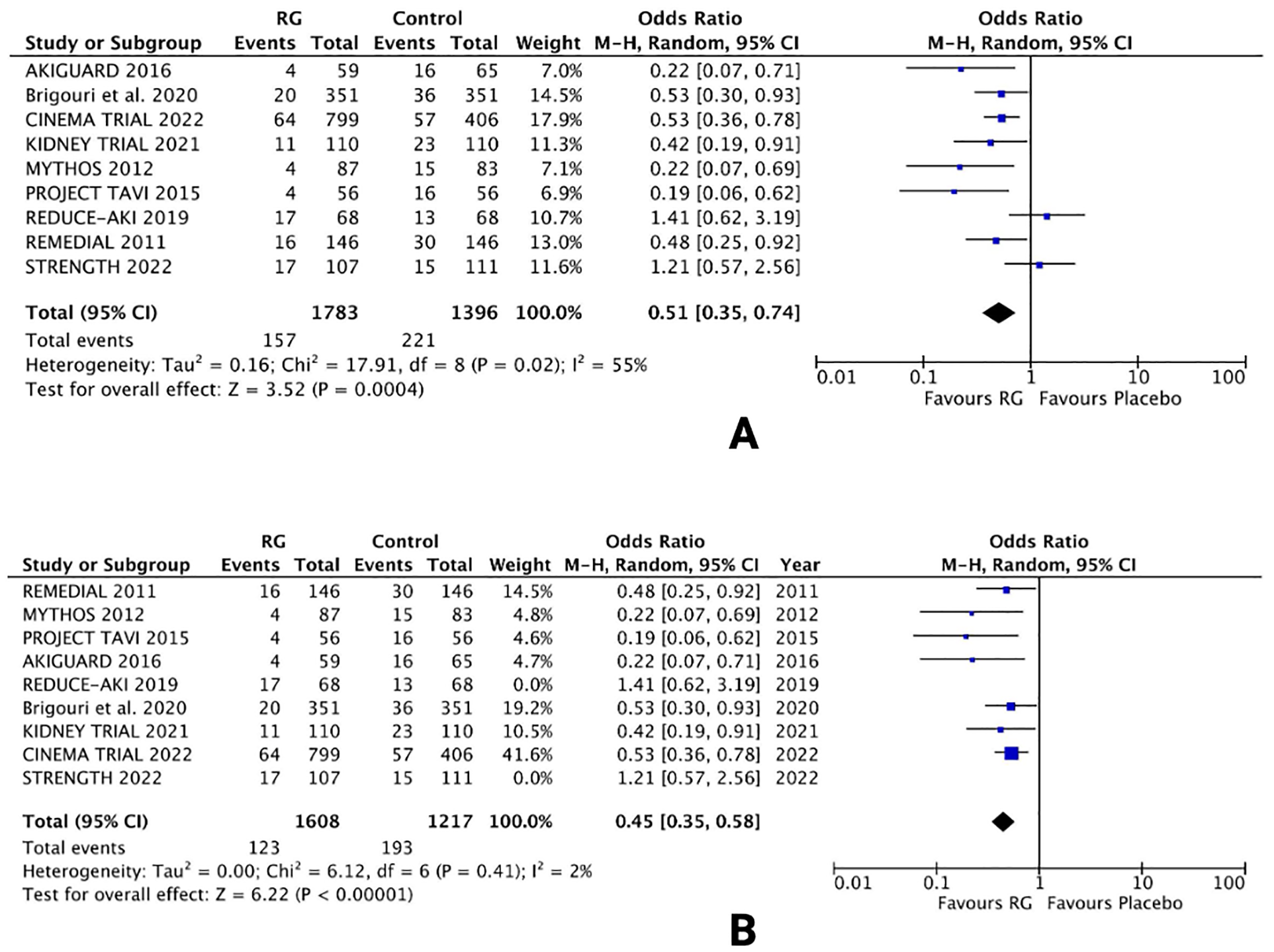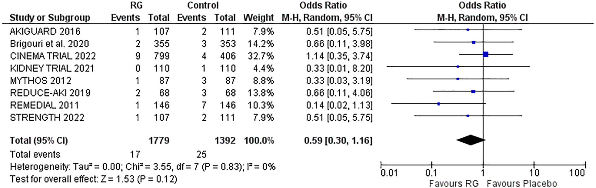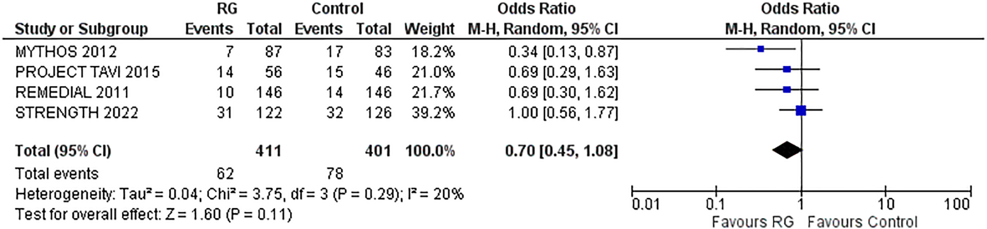 Owing to the moderate heterogeneity in the results, RCTs with low-quality assessment scores, varying demographics and number of patients were excluded in a sensitivity analysis. Removing 2 RCTs [REDUCE-AKI 2019 (20) and STRENGTH 2022 (24)] lowered the heterogeneity from I2 = 55% to I2 = 2%. The results were unchanged, with the RG system carrying a lower risk of CIN vs. control [OR 0.45; 95% CI (0.35, 0.58), P < 0.0001; Figure 2B], respectively.
