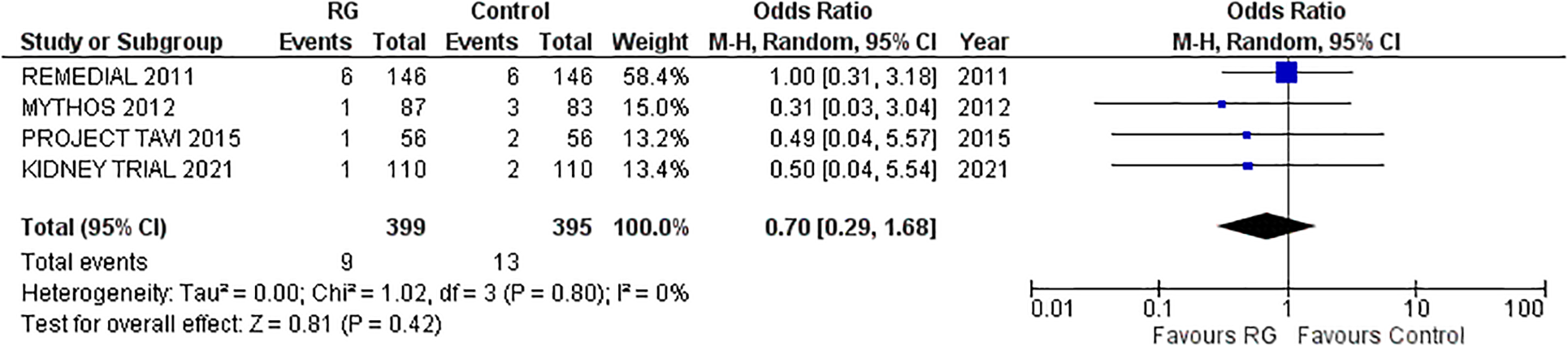 In contrast to previous meta-analyses demonstrating a significant reduction in the need for RRT (hemodialysis, hemofiltration, etc.) with the RG system, our meta-analysis found similar rates of RRT between RG and alternative volume expansion technique recipients (26–29). This discrepancy may be attributed to the heterogeneity in treatment strategies in the control group and a low number of events in previous analyses (26–29). Additionally, the inclusion of observational studies and fewer RCTs in previous meta-analyses might have overestimated the effect size (26–28). The observed similarity in RRT need despite lower CIN rates in RG recipients could be influenced by factors beyond CIN prevention. Patients undergoing contrast-related procedures may have pre-existing renal conditions, varied baseline renal function, and individual responsiveness to renal protection strategies, that elevate their overall risk of requiring RRT, irrespective of CIN prevention efforts. The multifactorial nature of renal complications in patients undergoing medical procedures makes it challenging to attribute the necessity for RRT solely to the prevention or occurrence of CIN. Moreover, variability in study designs, procedural factors (e.g., general anesthesia, blood pressure, transapical access, bleeding, and rapid pacing), post-procedural (e.g., blood transfusion) and follow-up protocols, and type of procedures (e.g., emergent vs. elective, complex interventional vs. diagnostic) across included studies could contribute to the varying effectiveness of RG in preventing renal complications, explaining the lack of significant statistical difference in RRT need in our meta-analysis (16–24).