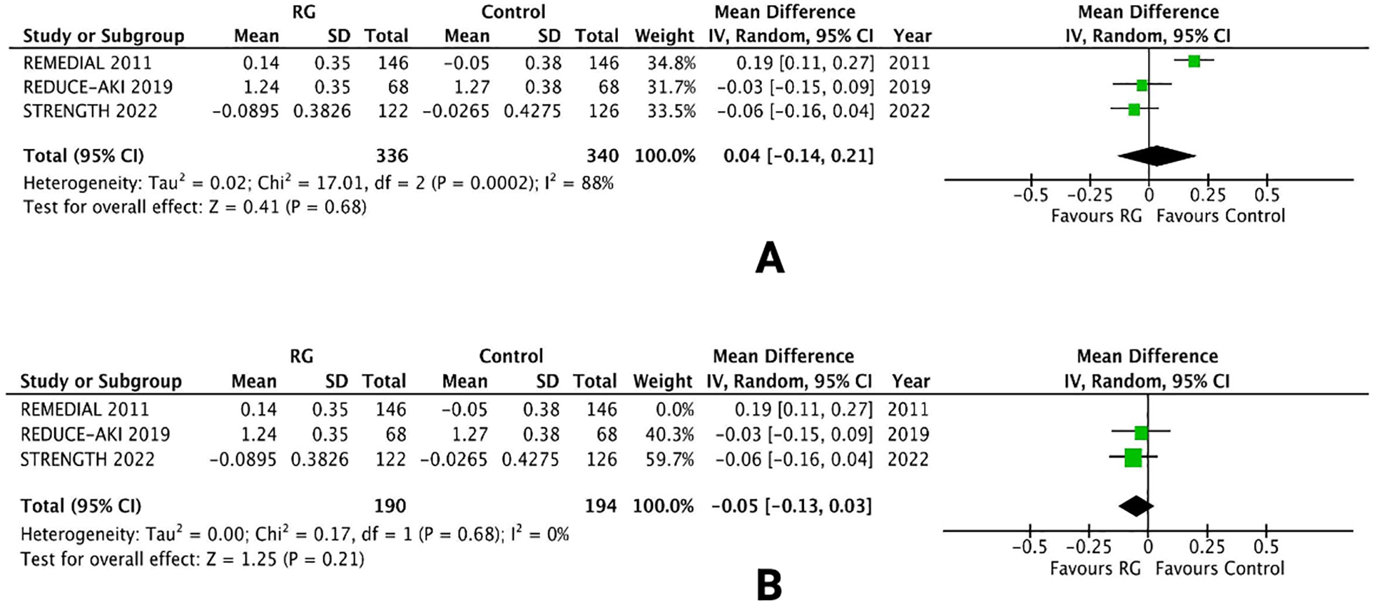 A leave-one-out sensitivity analysis was performed to reduce the heterogeneity of the outcome. Removing one trial [REMEDIAL 2011 (16)] reduced the heterogeneity from I2 = 88% to I2 = 0%. There was no change in the overall results and the difference between the two groups was not significant [WMD −0.05; 95% CI (−0.13, 0.03), P = 0.21; Figure 7B].