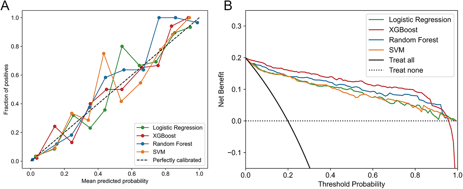 In addition, we used several evaluation metrics on the testing set to assess the performance of different ML models, including the area under the receiver operating characteristic curve (AUC), accuracy, sensitivity, specificity, precision, recall, and F1 score. Calibration curves were used to evaluate calibration capability, and decision curve analysis (DCA) was used to evaluate clinical applicability.