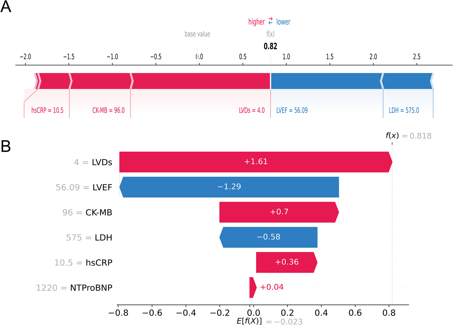 When applying ML predictive models to clinical decision-making, it is crucial to understand how the model predicts individual risk. Therefore, we utilized the SHAP method to visually interpret the optimal mode (22) and to observe the contribution of features to the model's output at the individual level. By randomly selecting one patient who did not develop HF during follow-up and another who did, we evaluated the contribution of features to individual predictions, providing a tailored risk assessment for each patient.