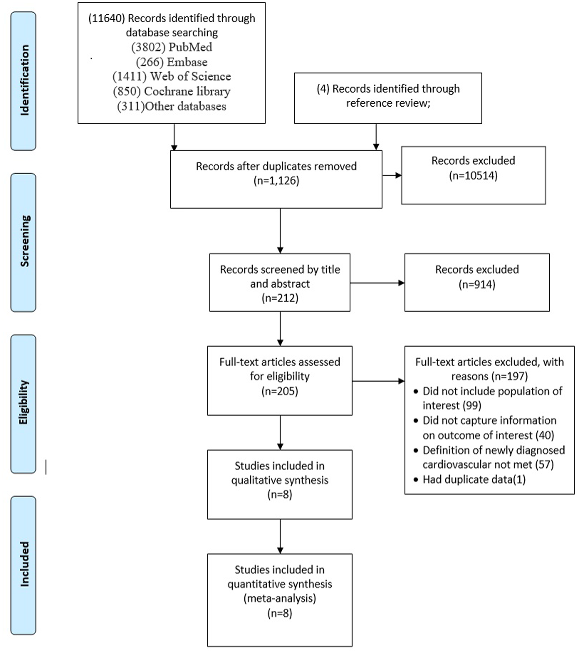 The search yielded 11,640 citations. After duplicates were removed and titles and abstracts were reviewed, 11,428 articles were excluded. Of the remaining 212 studies, full-text articles for all 205 were available. Of these, 197 were then excluded after reviewing the full-text manuscripts. After several stages of review, eight (23–30) eligible studies were included in the meta-analysis (Figure 1; Table 1). This meta-analysis incorporates data from eight studies that utilized a control group design. The analysis encompasses a vast participant pool of 10 million individuals aged between 35 and 75 years. The follow-up period for the included studies ranges from 2 to 12 months.