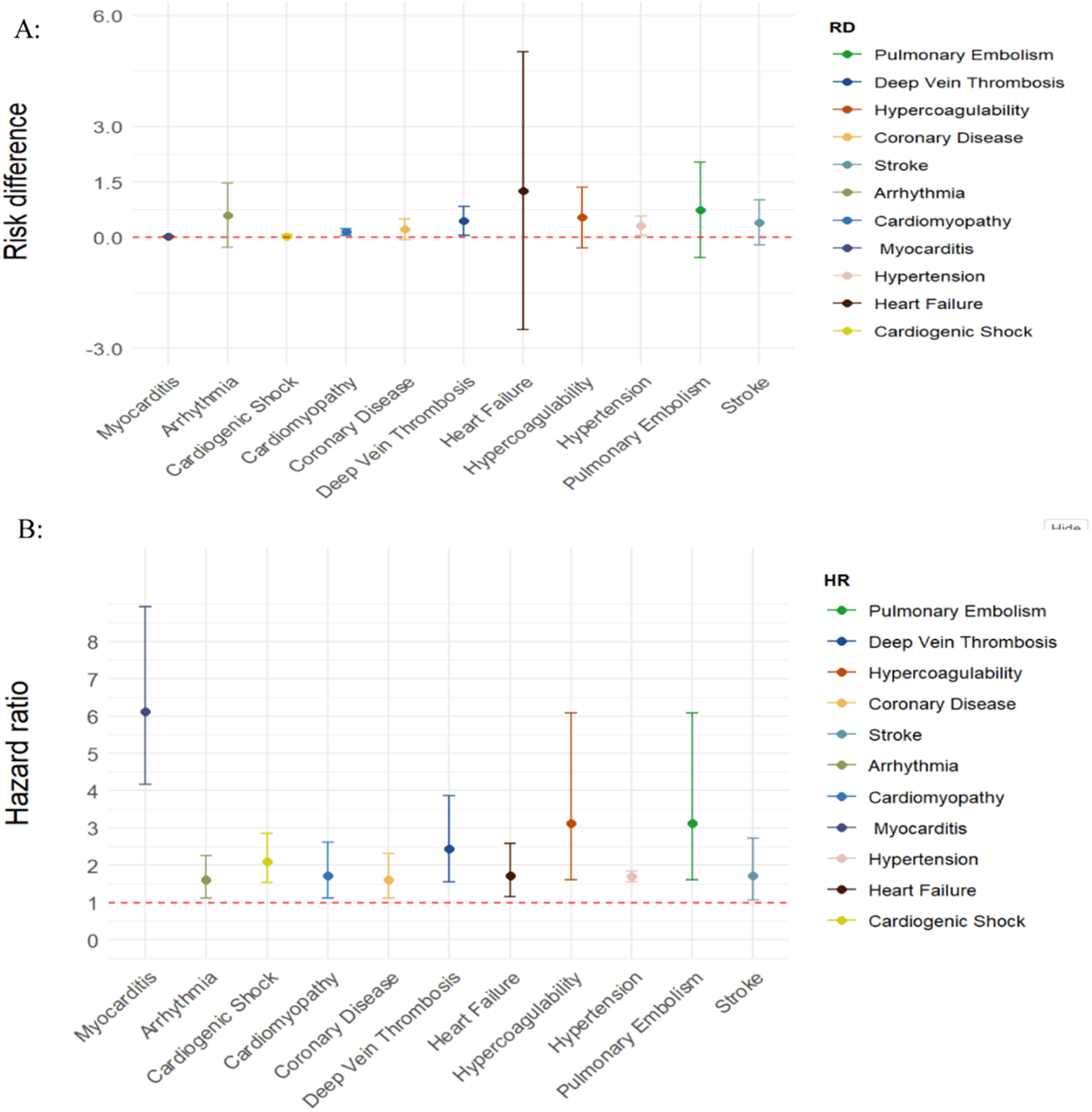SARS-CoV-2 group vs. comparison group for risk difference per 100 individuals (A) and hazard ratio (B) for clinical sequelae in long COVID-19.