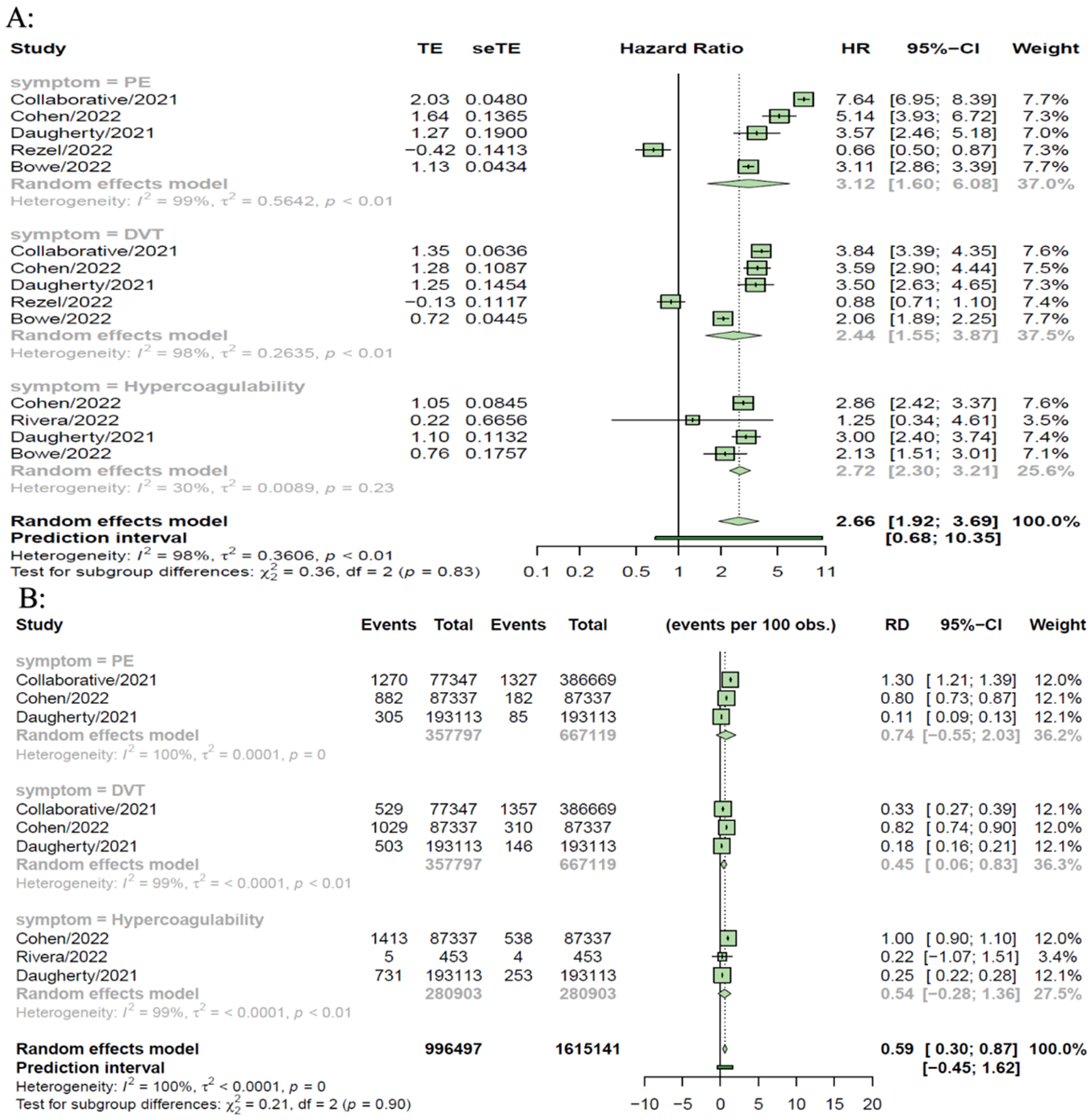 SARS-CoV-2 group vs. comparison group for risk difference per 100 individuals (A) and hazard ratio (B) for thromboembolic disorders in long COVID-19.