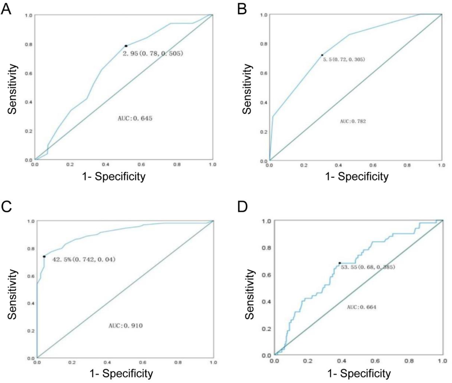ROC curve. (A) IMA; (B) LA; (C) Thrombus ratio; (D) Maximum diameter.