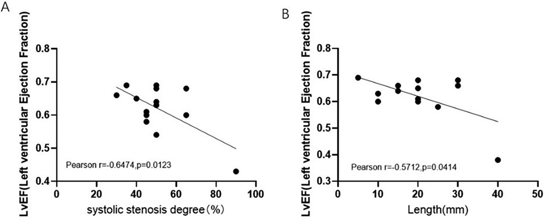 Correlation between MIC imaging index and LVEF of MIC-CHD patients. (A) Relation between MIC systolic stenosis degree and LVEF of patients with MIC-CHD. (B) The correlation between MCA length LVEF of patients with MIC-CHD. LVEF, left ventricular ejection fraction.
