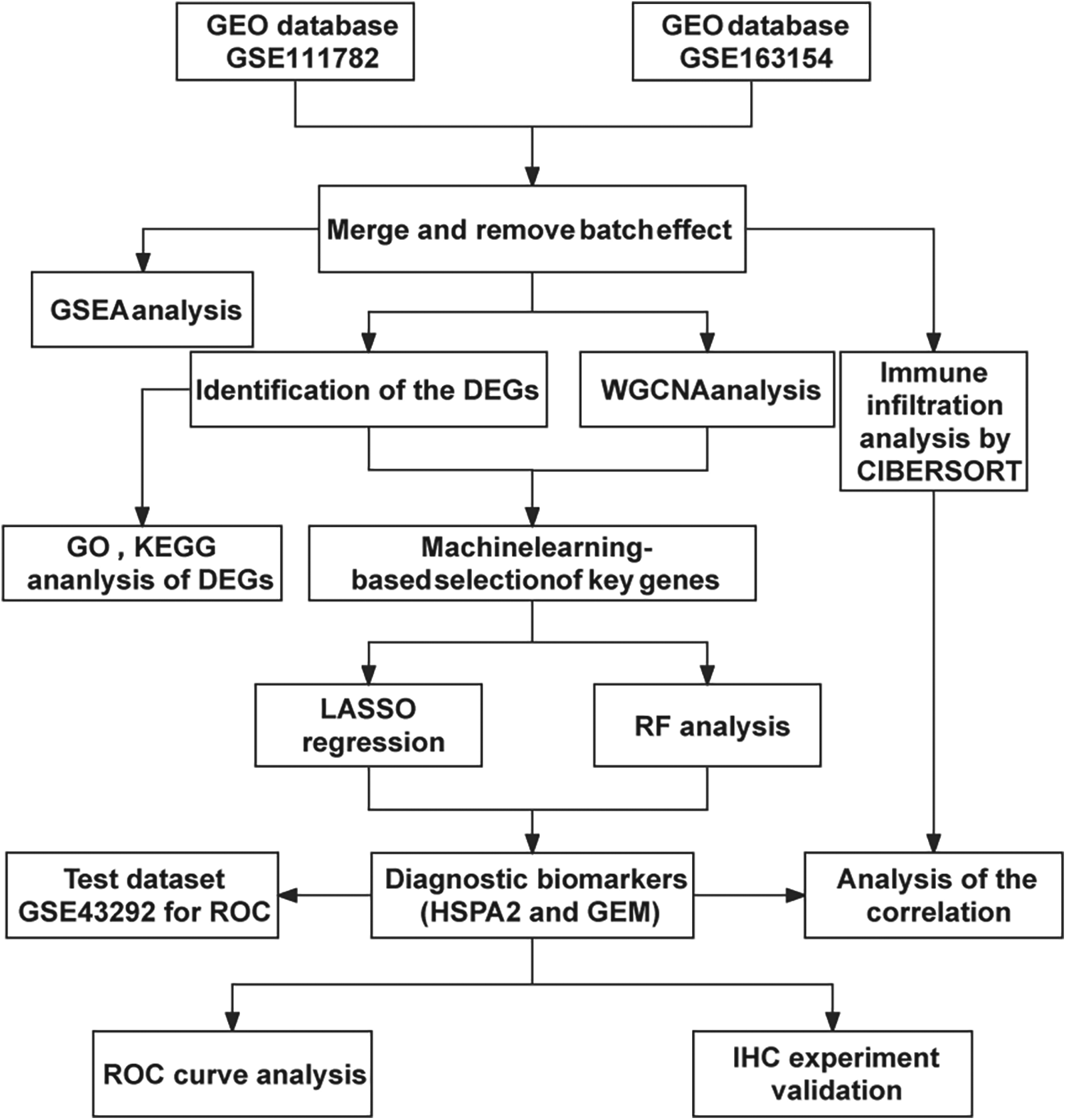 The datasets GSE163154 and GSE111782, obtained from the gene expression omnibus (GEO) database, were amalgamated for bioinformatics analysis, using the dataset GSE43292 as a test set. Sequentially, we performed principal component analysis (PCA), differential gene expression analysis, enrichment analysis, weighted gene co-expression network analysis (WGCNA), utilized a machine learning algorithm to screen key genes, conducted receiver operating characteristic (ROC) curve analysis and nomogram model to assess biomarker diagnostic efficacy, validated the biomarkers, and analyzed immune cell infiltration.