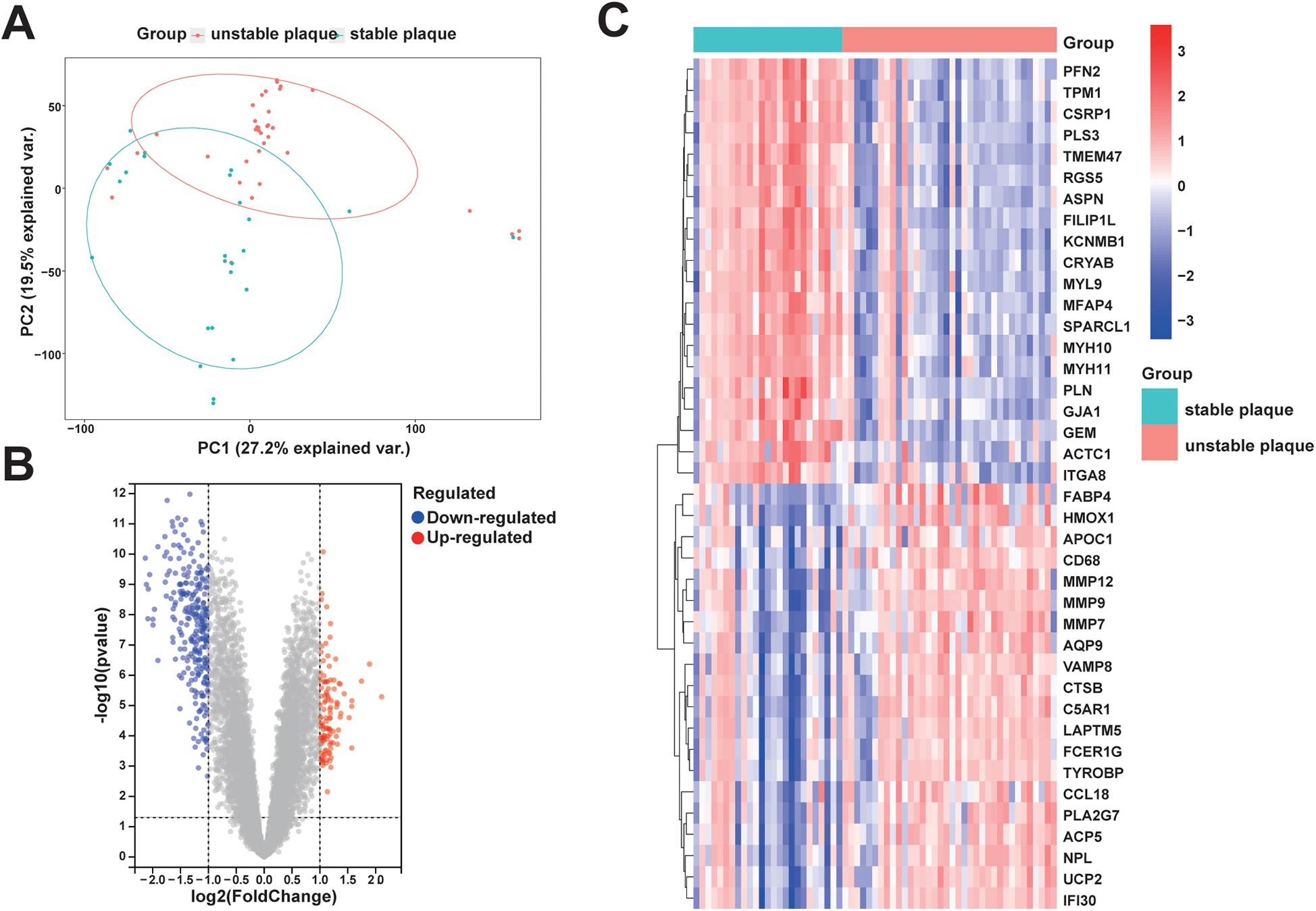 PCA and DEGs identification between unstable and stable plaque subgroups: (A) PCA plot of the merged dataset; (B) volcano plot of DEGs between unstable and stable plaque subgroups. Blue dots represent DEGs with down-regulated expression and red dots represent DEGs with up-regulated expression; (C) heatmap of relative expression levels of some DEGs.
