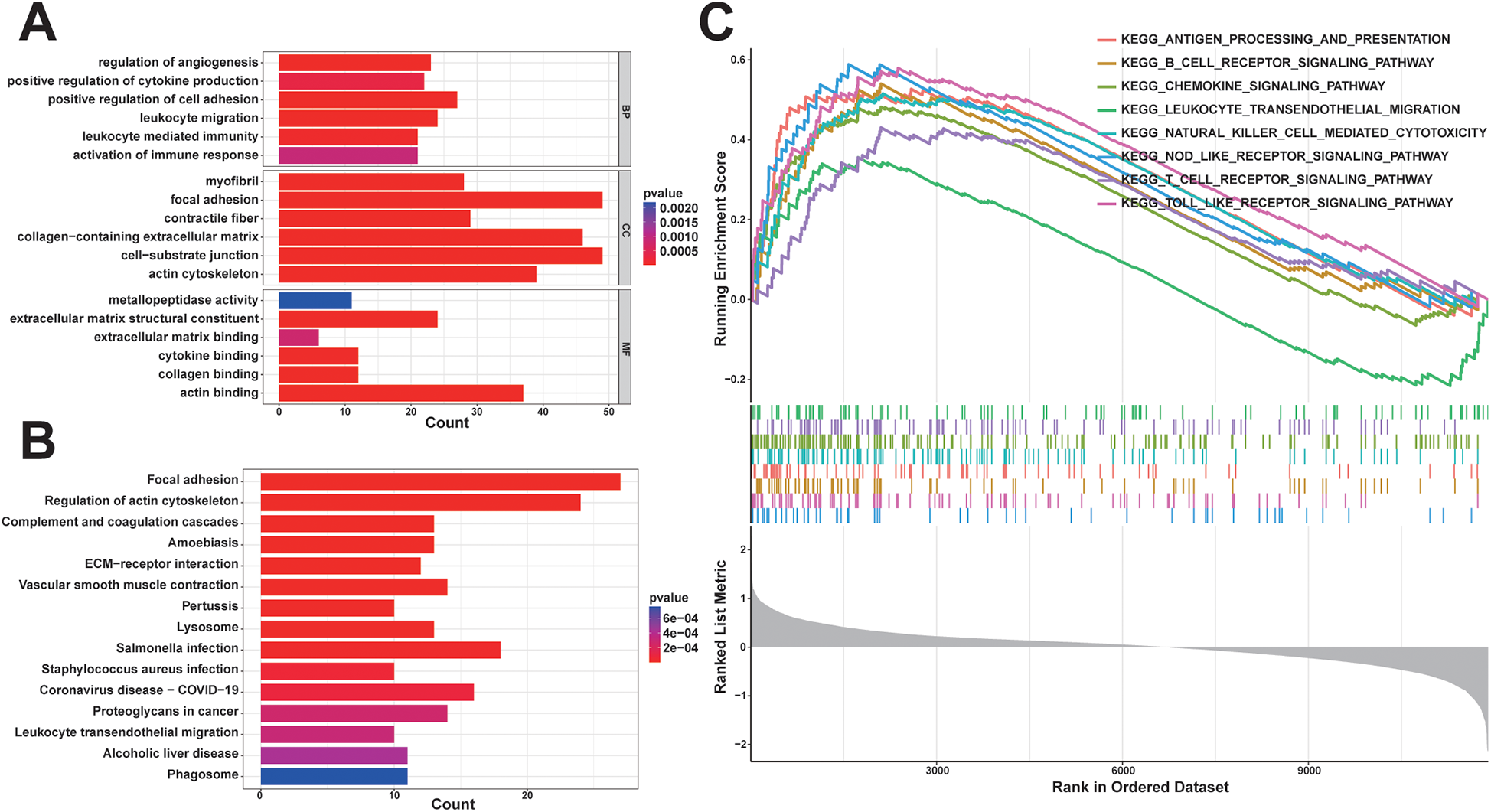 Functional enrichment analysis: (A) some representative enrichment results in GO enrichment analysis of DEGs; (B) KEGG enrichment analysis results of DEGs; (C) some representative significant enrichment pathways of GSEA-KEGG.