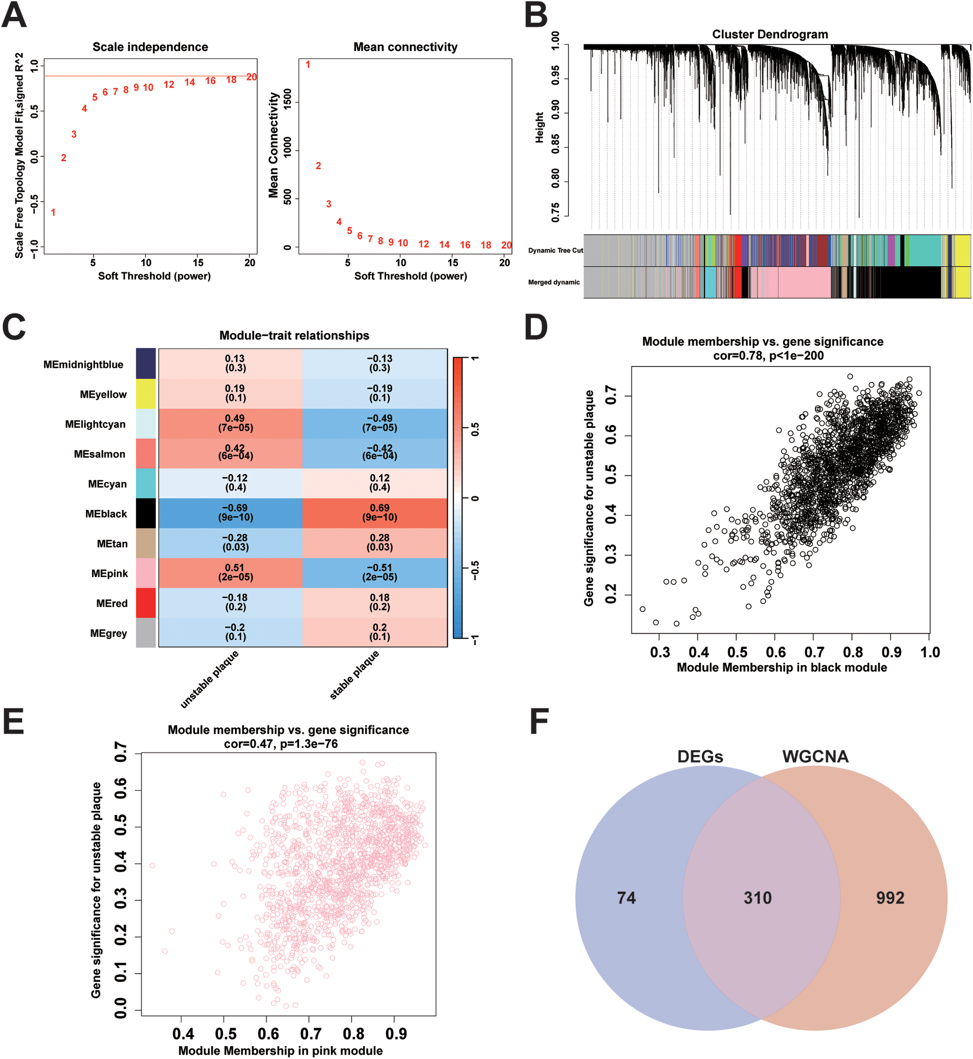 Weighted gene co-expression network construction and identification of key modules: (A) analysis of changes in scale-free topological fit index (left) and average connectivity (right) for different soft thresholds (β); (B) gene hierarchy clustering dendrogram. Different colours represent different co-expression modules; (C) heatmap of module eigengene correlation with traits. The black module and the pink module were significantly correlated with traits; (D) scatterplot of correlation between MM and GS of genes in the black module; (E) scatterplot of correlation between MM and GS for genes in the pink module; (F) Venn plots showing the intersection of key module genes with DEGs obtained from WGCNA analysis.