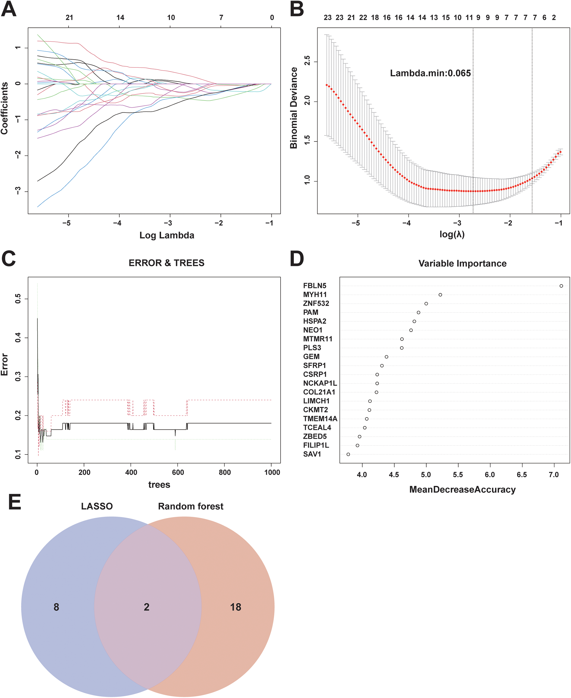 Screening of diagnostic markers using machine learning algorithms: (A) regression coefficient curves of genes in LASSO regression analysis; (B) selection of optimal tuning parameter (λ) based on ten-fold cross-validation of binomial deviance; (C) analysis of model error rate of RF algorithm in relation to the number of decision trees; (D) RF model average accuracy reduction ranking top 20 feature genes; (E) Venn diagram showing the intersection of the screening results of two machine learning algorithms.