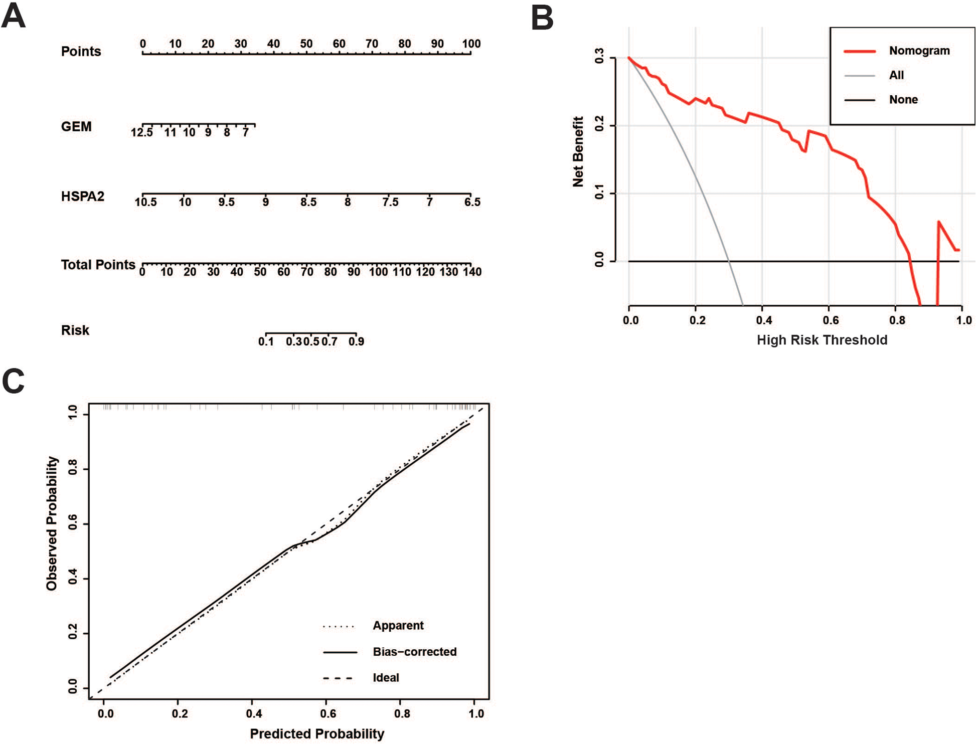 By intersecting DEGs with the key module genes derived from WGCNA, 310 genes were identified. Subsequently, two machine learning algorithms were employed to identify characteristic genes. The least absolute shrinkage and selection operator (LASSO) regression model was constructed utilizing the R package glmnet, with the parameter “alpha = 1” configured to introduce a penalty term. As the regularization parameter lambda increases, the regression coefficients of the model variables gradually approach 0. Ten-fold cross-validation was employed to select lambda.min as the optimal value of lambda, yielding ten feature genes corresponding to lambda.min. Random forest (RF) analysis was conducted utilizing the R package randomForest, with the parameter “ntree = 1,000” determined based on the number of decision trees corresponding to the minimum model error. The top 20 feature genes were selected based on the Mean Decrease Accuracy (MDA) of the model, a method used for gene importance ranking. Heat shock-related 70 kDa protein 2 (HSPA2) and GTP binding protein overexpressed in skeletal muscle (GEM) were identified by intersecting the results of the two machine learning algorithms described above. The Wilcoxon rank sum test was employed to evaluate the statistical significance of differences in biomarker expression between unstable and stable plaques in both training and test sets. The R package pROC was utilized to generate a receiver operating characteristic (ROC) curve, and the area under the curve (AUC) was computed to evaluate the diagnostic efficacy of the biomarkers for unstable plaques in both the training and test cohorts. Using the “rms” and “rmda” package, we constructed a nomogram of the marker genes GEM and HSPA2 based on multifactorial regression analysis, and plotted clinical decision curve analysis (DCA) and calibration curve.