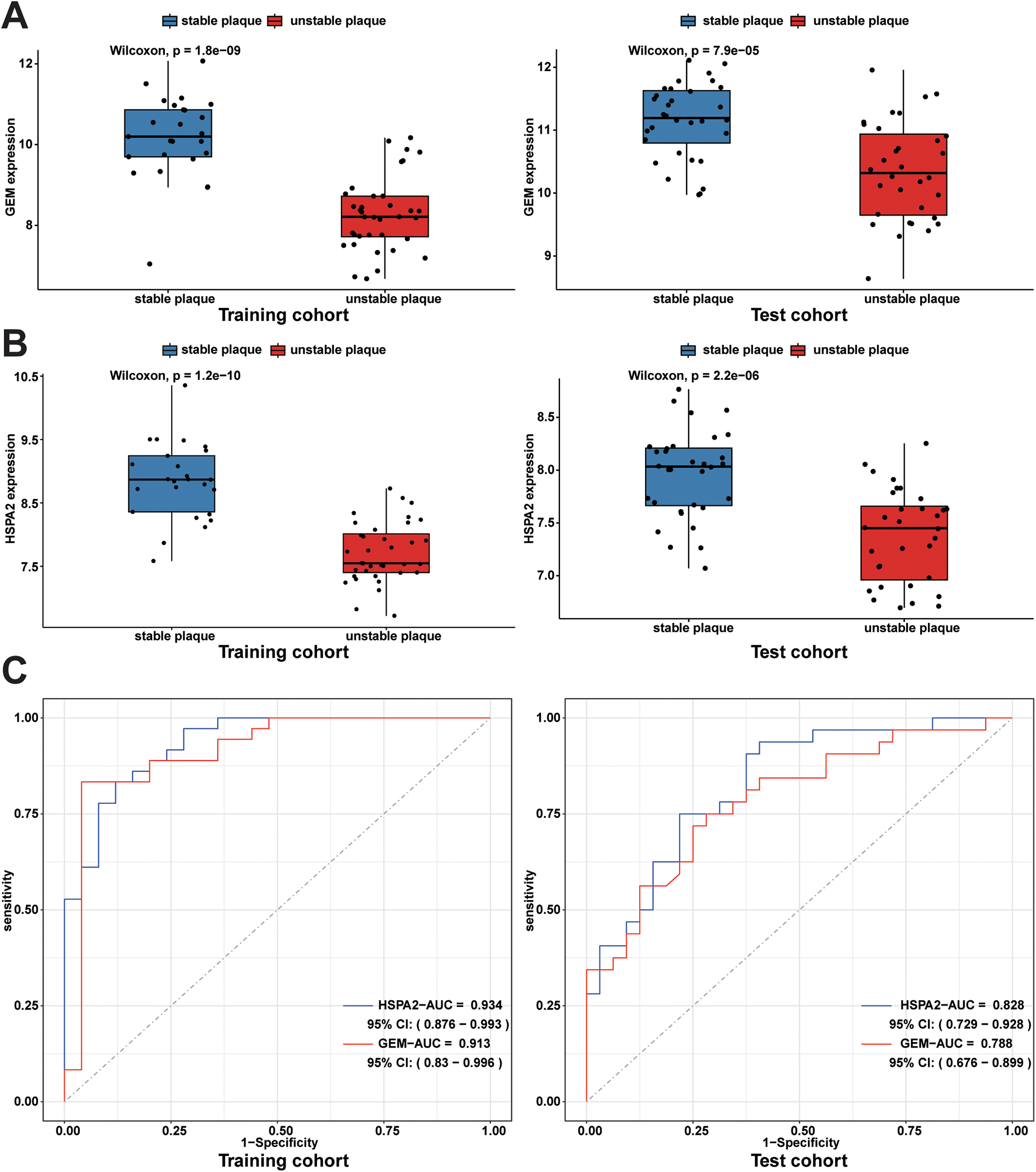 Expression levels of diagnostic biomarkers and assessment of diagnostic efficacy in the training and test cohorts: (A) box line plots of GEM expression in unstable plaque subgroups and stable plaque subgroups in the training cohort and test cohort; (B) box plots of HSPA2 expression in unstable and stable plaque subgroups in the training and test cohorts; (C) ROC curves for diagnostic efficacy assessment of HSPA2 and GEM in the training cohort and test cohort.
