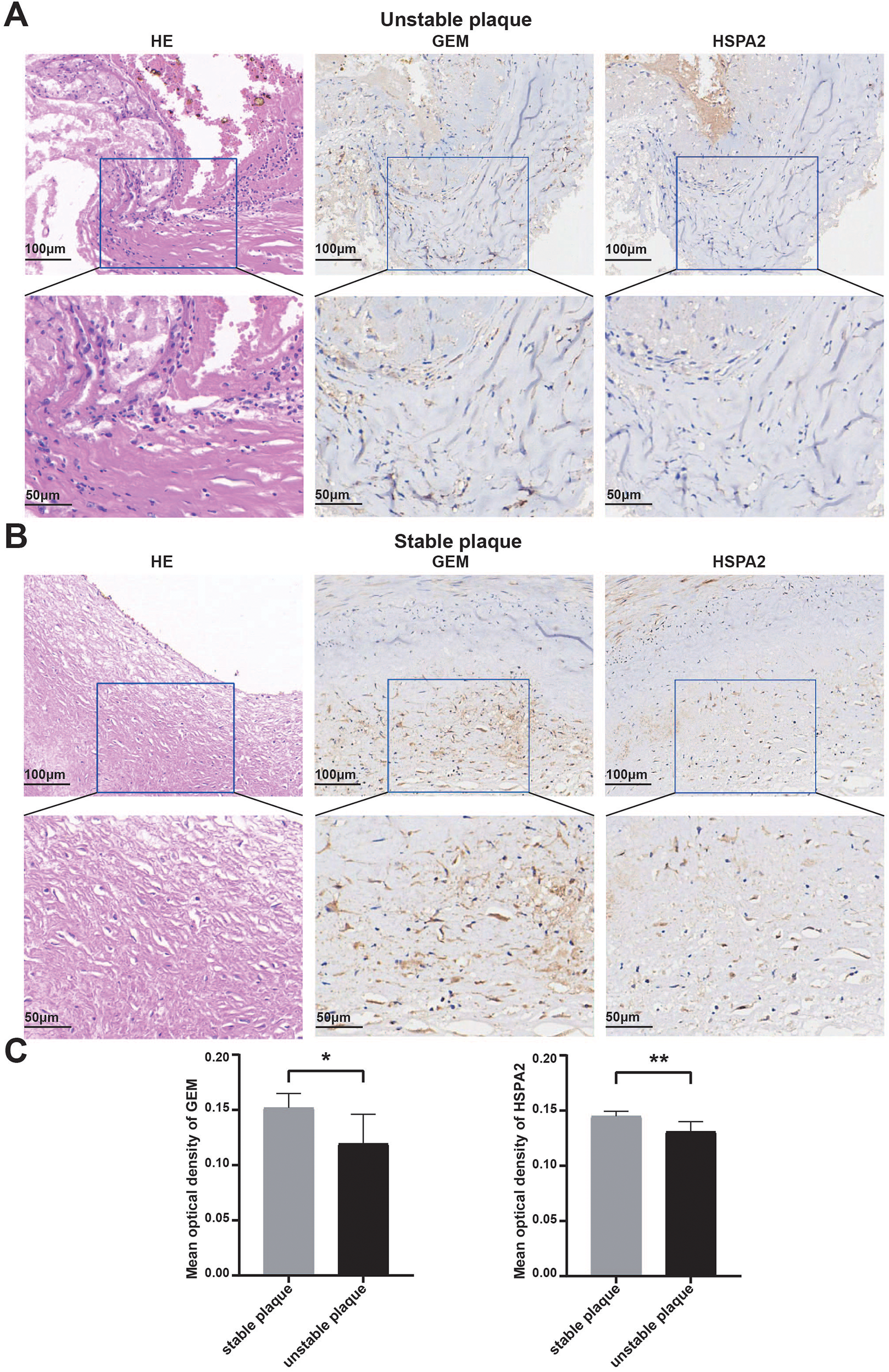 Validation of diagnostic biomarkers by human tissue samples: (A,B) representative images of hematoxylin-eosin staining of unstable coronary atherosclerotic plaques and stable coronary atherosclerotic plaques and IHC staining of GEM and HSPA2 proteins; (C) results of quantitative analysis of GEM and HSPA2 in different subgroups. Data were expressed using mean ± SD. * represents <0.05, ** represents <0.01.