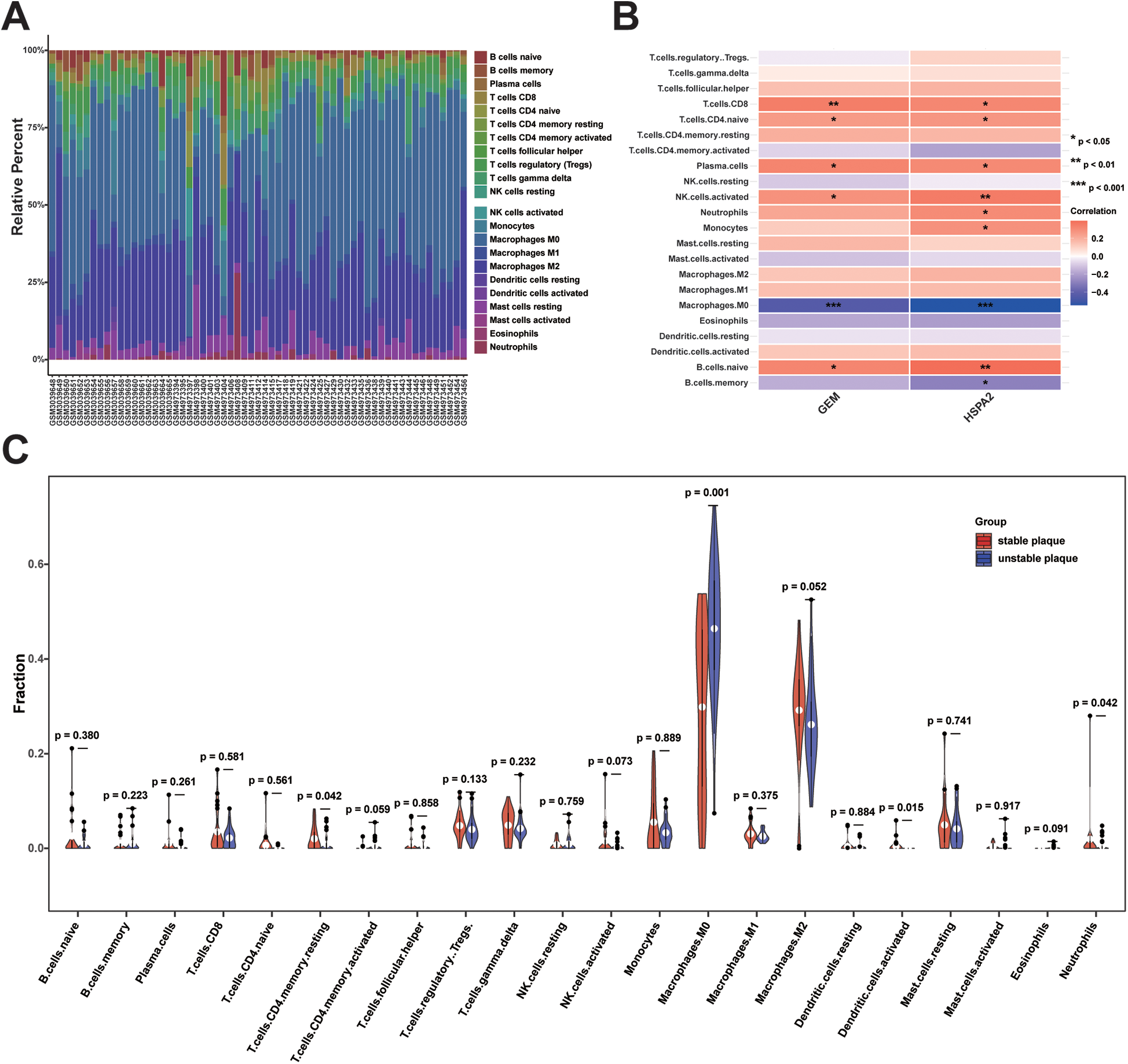 To investigate disparities in immune cell infiltration between stable and unstable plaque groups, we conducted immune cell infiltration analysis utilizing the CIBERSORT algorithm. The results of the CIBERSORT analysis revealed 22 immune cell sub-populations in 61 samples. Among these, Naïve B cells, gamma delta T cells (γδ T cells), Tregs, M0 macrophages, M2 macrophages, and resting mast cells predominated in atherosclerotic plaques (Figure 9A). The proportion of M0 macrophage infiltration was significantly higher in unstable plaques compared to stable plaques (p < 0.05). Conversely, the proportions of resting CD4 + memory T cells, activated dendritic cells, and neutrophils were relatively elevated in stable plaques (p < 0.05) (Figure 9C). Additionally, correlation analysis between diagnostic biomarkers and immune cells revealed significant positive correlations of CD8+ T cells, naïve CD4+ T cells, plasma cells, activated natural killer cells, and naïve B cells with both GEM and HSPA2, whereas M0 macrophages exhibited significant negative correlations with both GEM and HSPA2 (Figure 9B). These findings suggest a potential role of immune cell infiltration in the formation of unstable plaques.