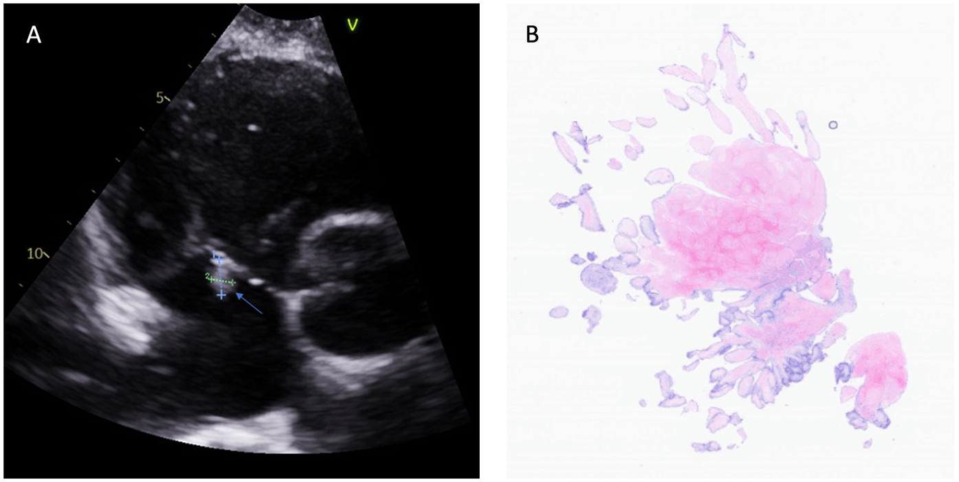 Fibroelastoma on the septal leaflet of the tricuspid valve. (A) Transthoracic echocardiography identified a small, mobile mass on the septal leaflet of the tricuspid valve (indicated by the arrow). (B) Light microscopy (hematoxylin and eosin staining of the mass at 40× magnification) revealed the characteristics of the papillary fibroelastomas.