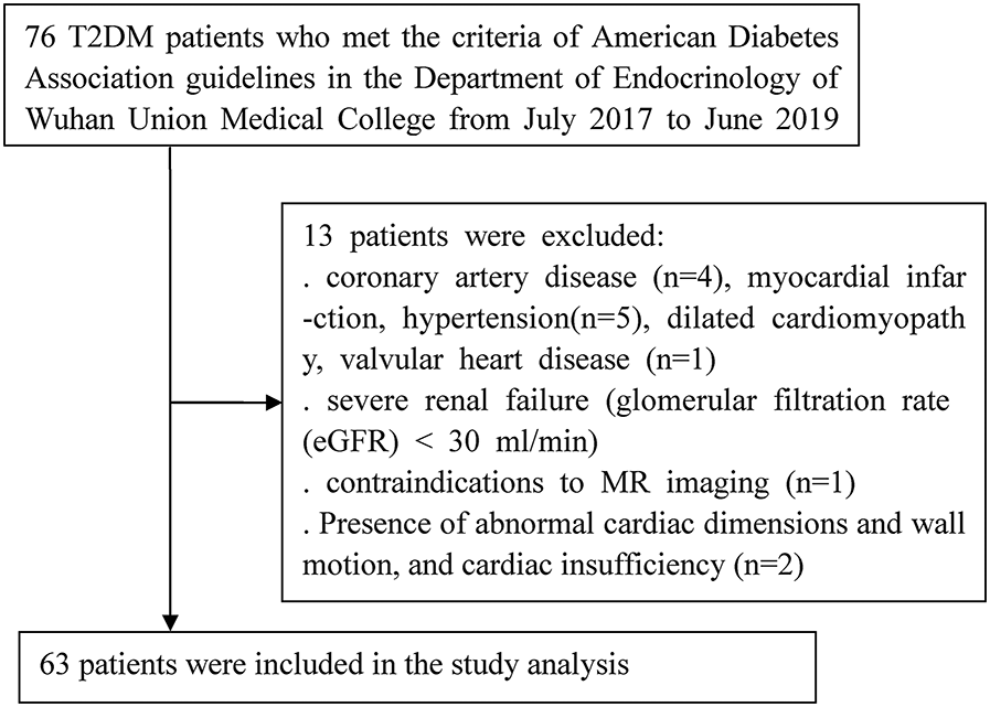 From July 2017 to June 2019, 76 consecutive T2DM patients required to meet the current American Diabetes Association guidelines (10) were prospectively recruited from the department of endocrinology at Wuhan Union Hospital. T2DM patients. The exclusion criteria encompassed clinical evidence of coronary artery disease, myocardial infarction, hypertension, dilated cardiomyopathy, valvular heart disease, severe renal failure [glomerular filtration rate (eGFR) < 30 ml/min], contraindications to MR imaging, the presence of abnormal cardiac dimensions and wall motion, and cardiac insufficiency (LVEF < 50%). Finally, 63 T2DM patients and 50 healthy controls were enrolled in this study (Figure 1). For comparison, 50 healthy volunteers matched by age, sex and BMI from the community with no history of cardiac disease or diabetes mellitus, hypertension, hyperlipidemia. All recruited normal volunteers underwent physical examination with normal results. The exclusion criteria includedrenal dysfunction (glomerular fltration rate < 30 ml/min), active pregnancy, contraindications for MRI, left ventricular hypertrophy, presence of abnormal cardiac dimensions, global or regional LV wall motion abnormalities, valvular stenosis or regurgitation or myocardiall LGE during the MRI examination. This study was registered at the Chinese Clinical Trials Registry Center registration number (ChiCTR2000039816), and was approved by the Ethics Committee of Tongji Medical College, Huazhong University of Science and Technology [No. (2019)S878]. Each participant provided written informed consent.
