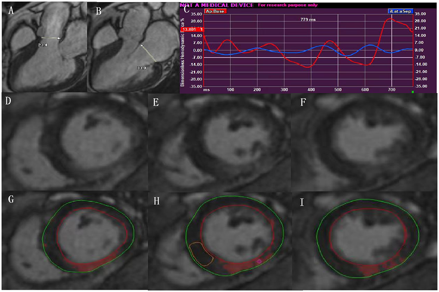 In the context of the endocardial border tracking used for LVGLS calculation, HDF can be acquired by measurements of the aortic and mitral diameter in the LV 3-chamber view (A,B), and with corresponding HDF curves (C); representative contours of LV LGE images from basal-apical segments in a patient with type 2 diabetes (D–F). The same images showing quantification of LGE using the 5SD thresholding method (G–I). LVGLS, left ventricular global longitudinal strain; HDF, hemodynamic forces; LGE, late gadolinium enhancement.