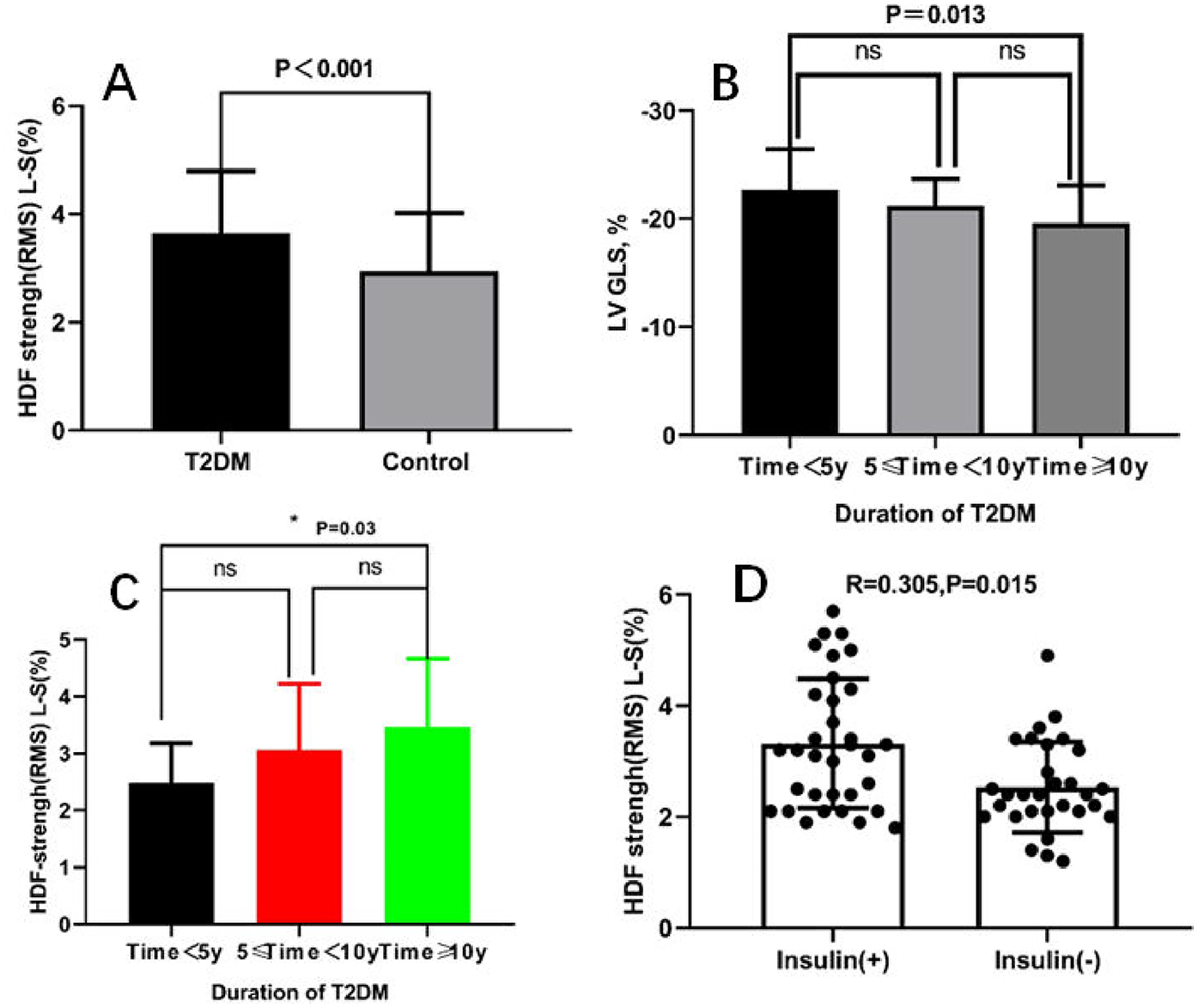 Comparison of t HDF strength (RMS) L-S vaule between T2DM and control (A) comparison of LVGLS and HDF strength (RMS) L-S vaule among different course of diabetic patients (B,C); the relationship between HDF strength (RMS) L-S and insulin treatment in diabetic patients (D). T2DM, type 2 diabetes mellitus; LVGLS, left ventricular global longitudinal strain; HDF, hemodynamic forces; RMS, root mean square.