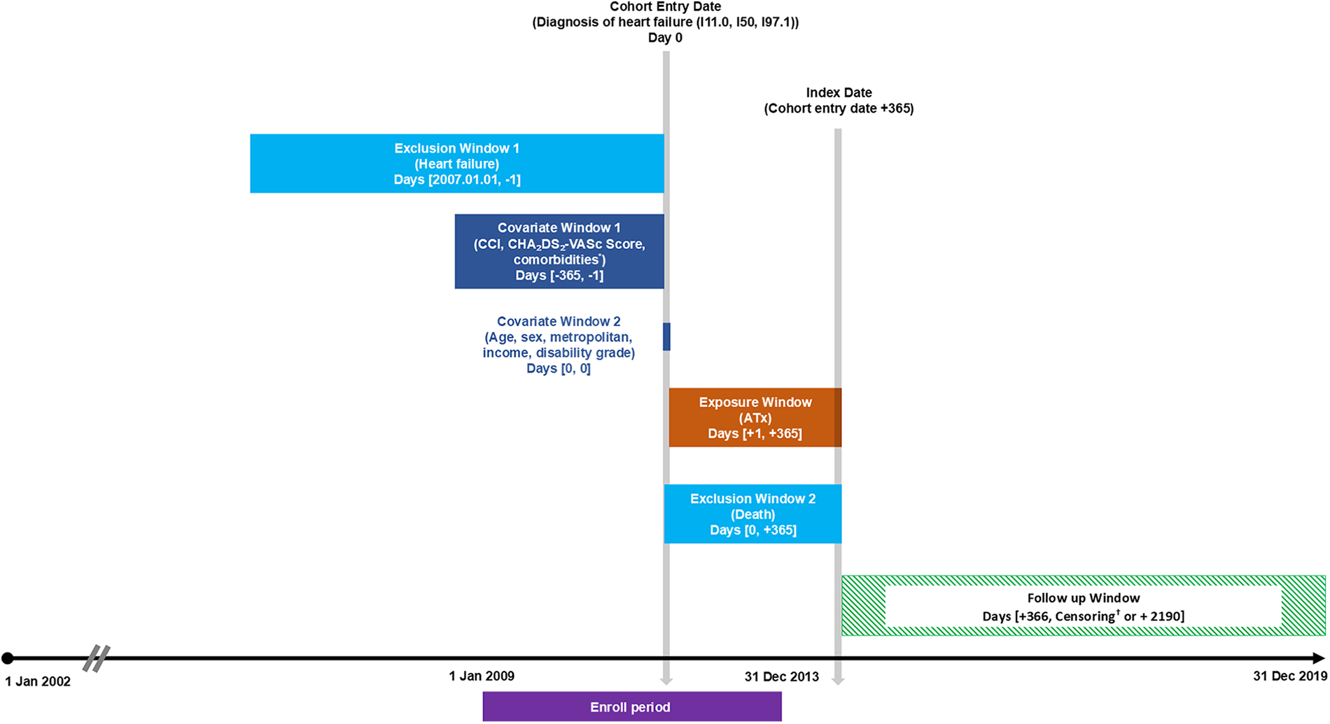 Exposure-based cohort entry restricted to adherent users. ATx, acupuncture treatment; CCI, Charlson comorbidity index. *Comorbidities included hypertension, diabetes mellitus, dyslipidemia, myocardial infarction, peripheral artery disease, chronic obstructive pulmonary disease, and cancer. †Censoring occurred at the first event—either death or the conclusion of the study period. Adapted with permission from “Exposure-based Cohort Entry Restricted to Adherent Users” by Schneeweiss S et al., licensed under CC BY 4.0.