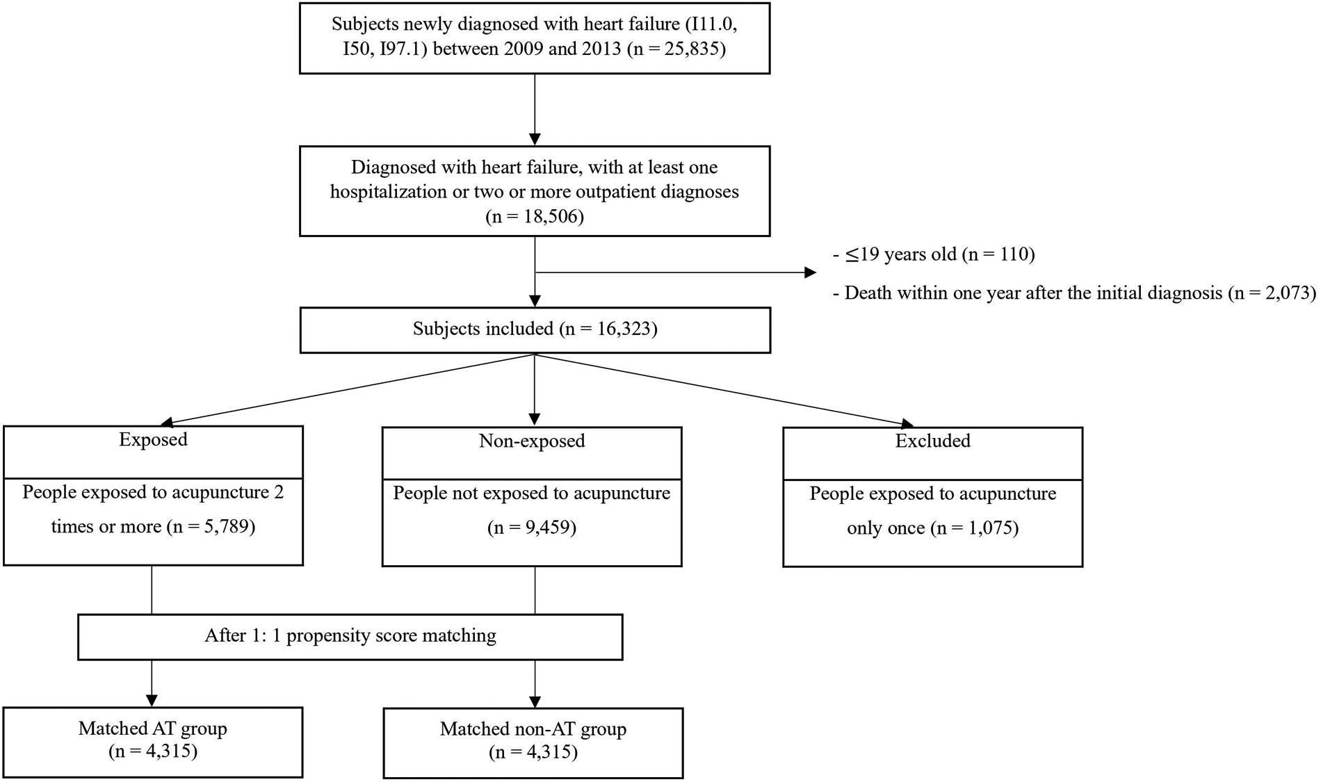 Using the 1-year landmark methodology, patients newly diagnosed with HF during the enrollment period were assigned to the acupuncture treatment-exposed group (AT group) if they underwent acupuncture two or more times within 1 year from diagnosis. Those who did not receive acupuncture within 1 year of diagnosis were categorized into the non-exposed acupuncture treatment group (non-AT group). Patients who received acupuncture treatment only once did not meet the criteria for either the AT group or the non-AT group and were therefore excluded. As there are no clear criteria for the number of acupuncture sessions and an appropriate landmark period for exposure assessment, the research team decided based on internal consensus and referred to existing studies (35–37). Acupuncture treatment was verified using the codes 40011 (single body part), 40012 (multiple body parts), 40030 (intra-orbital cavity), 40040 (intranasal sinus), 40050 (intra-peritoneal cavity), 40060 (intra-articular), 40070 (interspace of spinous process), 40080 (penetration), and 40091 (electro-acupuncture). Patients who received acupuncture, regardless of the acupoint or diagnostic relevance, were assigned to the AT group.