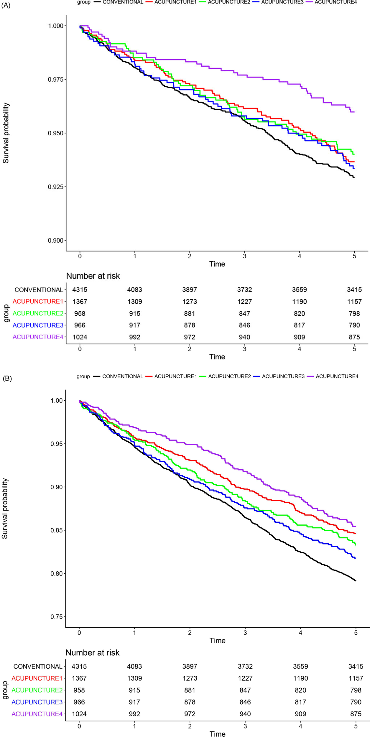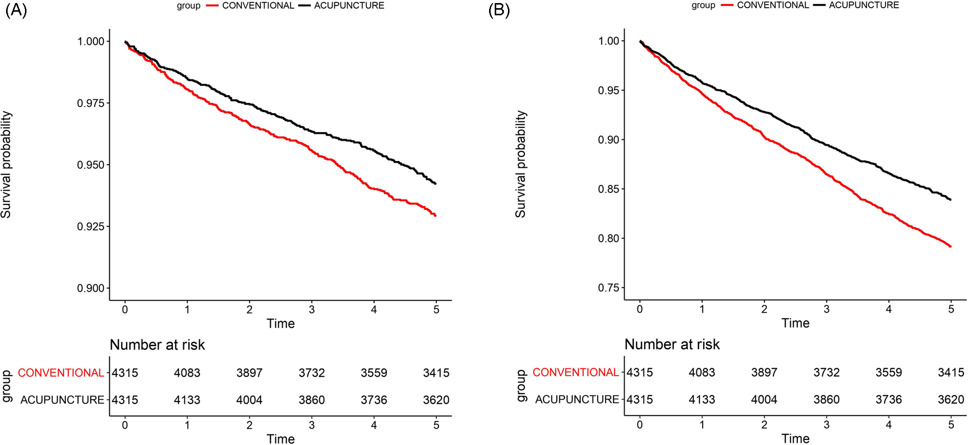 Kaplan–meier curves. Kaplan–Meier curves showing the survival probability in the acupuncture and non-acupuncture treatment groups after PS matching. Both A and B show p-values <0.05, indicating a significant difference. (A) Circulatory system disease-related mortality and (B) all-cause mortality.