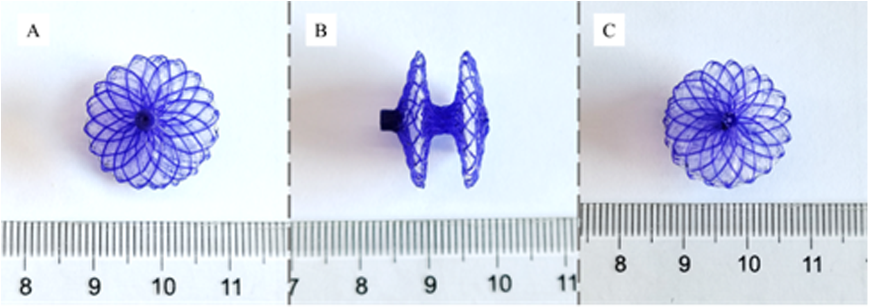 Biodegradable pansy® occluder. (A) Right atrium side view; (B) profile view; (C) left atrium side view.