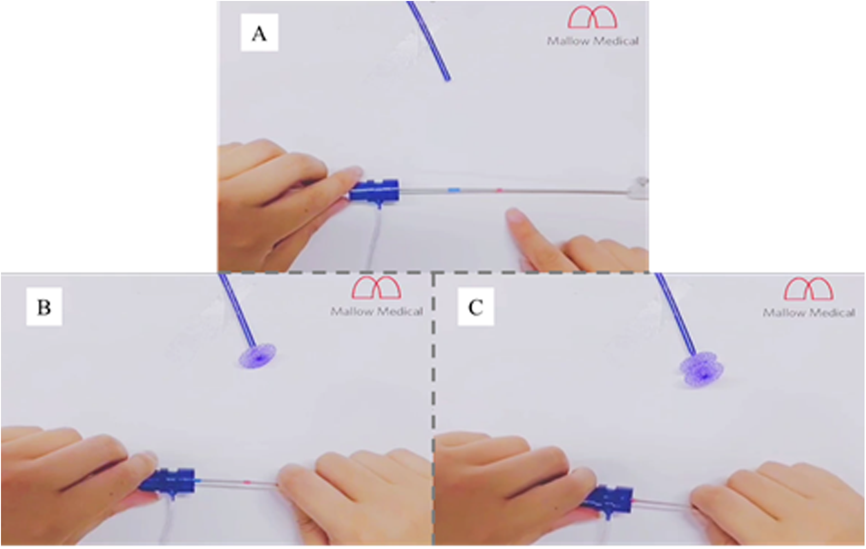 Specially made conveying cable. (A) The blue and red marking points correspond to the position of the left disc and right disc of the occluder after release. (B) The blue marking point correspond to the position of the left disc of the occluder after release. (C) The red marking point correspond to the position of the right disc of the occluder after release.