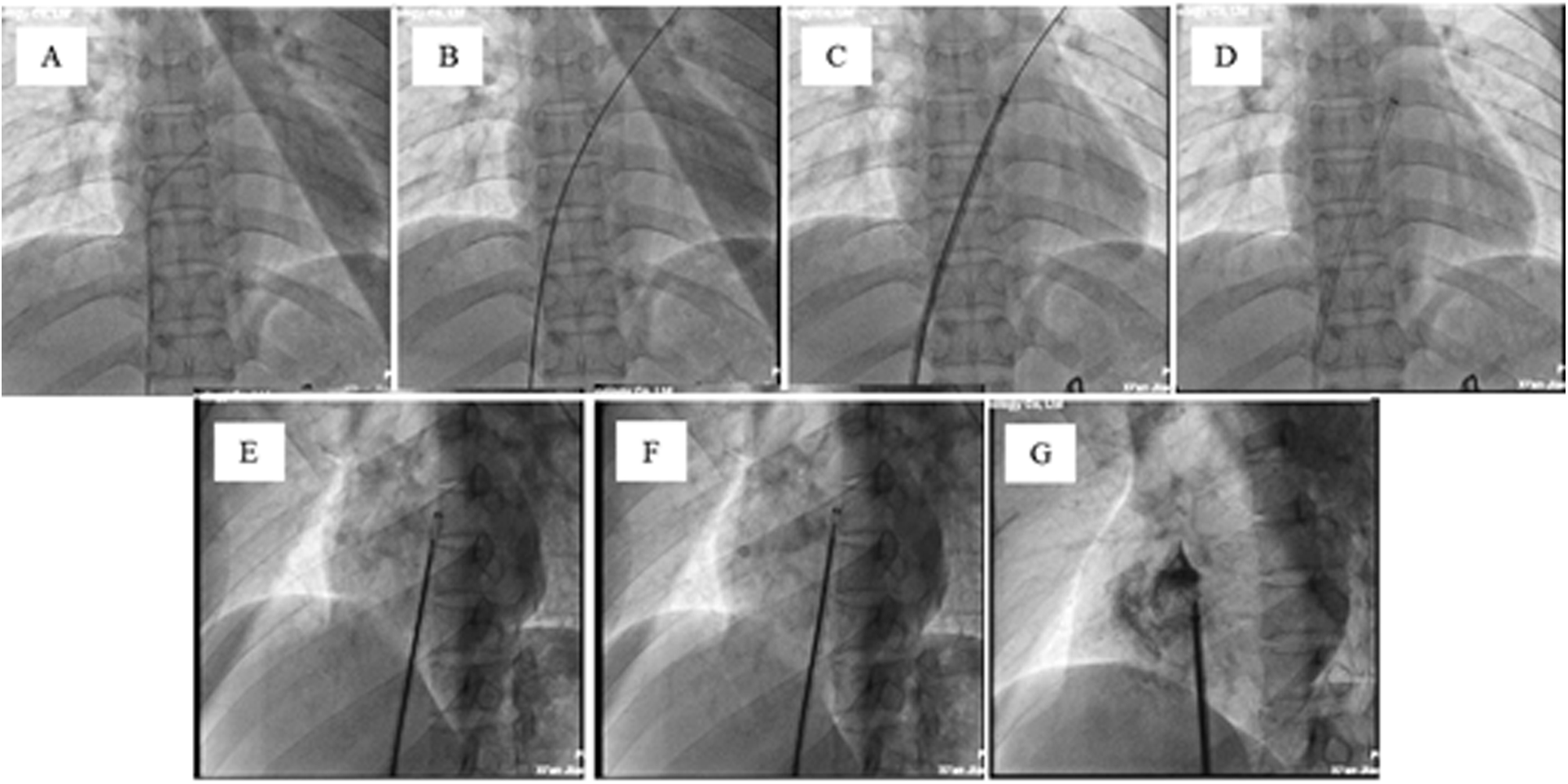 Transcatheter closure of the PFO with a biodegradable pansy® occluder. (A) A multipurpose (MP) diagnosticcatheter (6-Fr) is advanced over the wire to the base of the right atrium (RA). The catheter is directed towardthe interatrial septum (IAS), a maneuver that can be assisted by aligning the orientation of the MP catheter with the direction of theimaging element of the fossa ovale angiography. (B) A standard 0.035-inch J-tipped wire is advanced through the MP catheter across the PFO and into the left upper pulmonary vein (LUPV). (C) A 0.035-inch Amplatzer extrastiff guidewire (260 cm) is advanced over the MP catheter to the LUPV. Then, the delivery sheath is advanced over the 0.035-inch Amplatzer extra stiff guidewire to the left atrium. (D) The expansion sheath and the 0.035-inch Amplatzer extra stiff guidewireare withdrawn. (E) Under TTE guidance, the left disc of the occluder is opened and located in the left atrium. (F) Under TTE guidance, the right disc of the occluder is opened, and the occluder is located on the IAS. G. After the diluted contrast medium is delivered through the sheath, the occluder can be seen in good position, and the left and right discs are clearly separated.