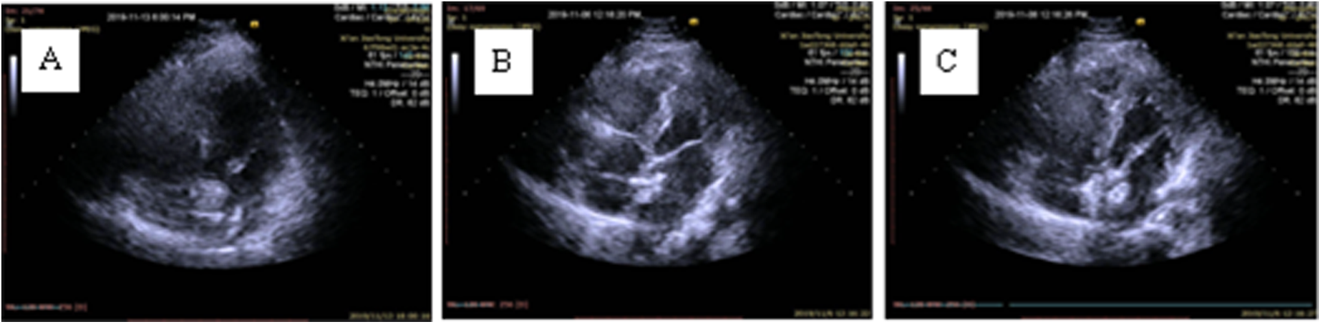 The severity of the shunt is a subjective assessment performed by cTTE/cTCD. Agitated saline was used as the contrast agent and consisted of 8 ml of saline solution, 1 ml of air, and 1 ml of blood collected from the patient. Contrast agent was injected into the left cubital vein as a bolus. When using cTTE, the apical four-chamber view was generally selected. The presence of RLS was confirmed when microbubbles (MBs) were seen in the left atrium within the first 3 cardiaccycles after MB appearance in the right atrium at rest or after the Valsalva maneuver (VM). According to Li Yue, et al. (10), theseverity of RLS was semiquantified into a four-level scale, and >30 MBs were defined as substantial RLS. According to current standards (11), cTCD with a TCD monitoring device (DWL MultidopX, ScanMed Medical, Gloucestershire, UK) can also be used to identify the degree of RLS. Both middle cerebral arteries were simultaneously monitored through the temporal window using 2 MHz probes. The contrast agent was used as mentioned above. The presence of RLS was confirmed when high-intensity transient signals (HITS) appeared within 25 s after contrast agent injection at rest or after VM. The severity of RLS was semiquantified into a four-level scale, and we defined substantial RLS as shower or curtain HITS.