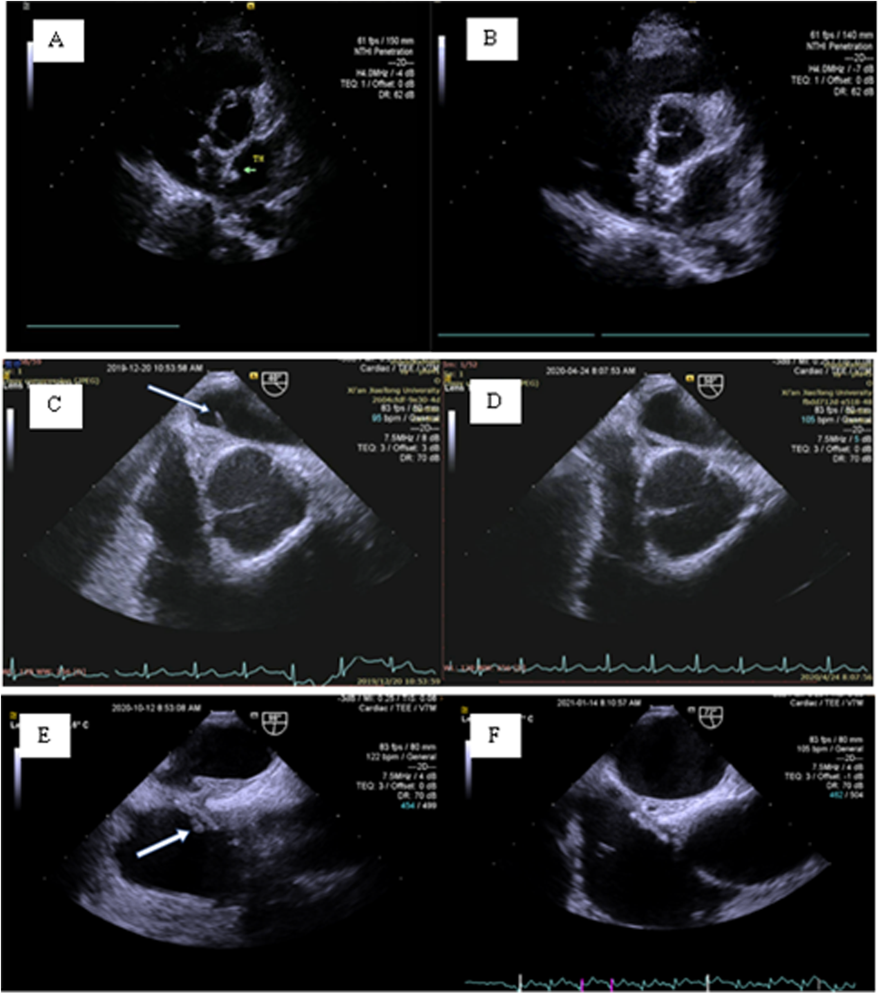 Postprocedure DRT. (A,B) A 42-year-old female: At the 3-month follow-up, TTE revealed a thrombus on the left disc of the occluder (green arrow). (C,D) A 45-year-old female: At the 6-month follow-up, TEE revealed an abnormal cord-like echo (7.4 × 1.7 mm) on the left disc of the occluder (white arrow). The follow-up medical history revealed that the patient was hit by a stone on her foot approximately 20 days after the procedure, and a red bruise appeared under the skin. The patient discontinued aspirin and clopidogrel by herself and concealed the history of discontinuation during the 3-month follow-up. (E,F) A 38-year-old female: At the 6-month follow-up, TEE revealed an abnormal strip of shadow on the right disc of the occluder (white arrow).