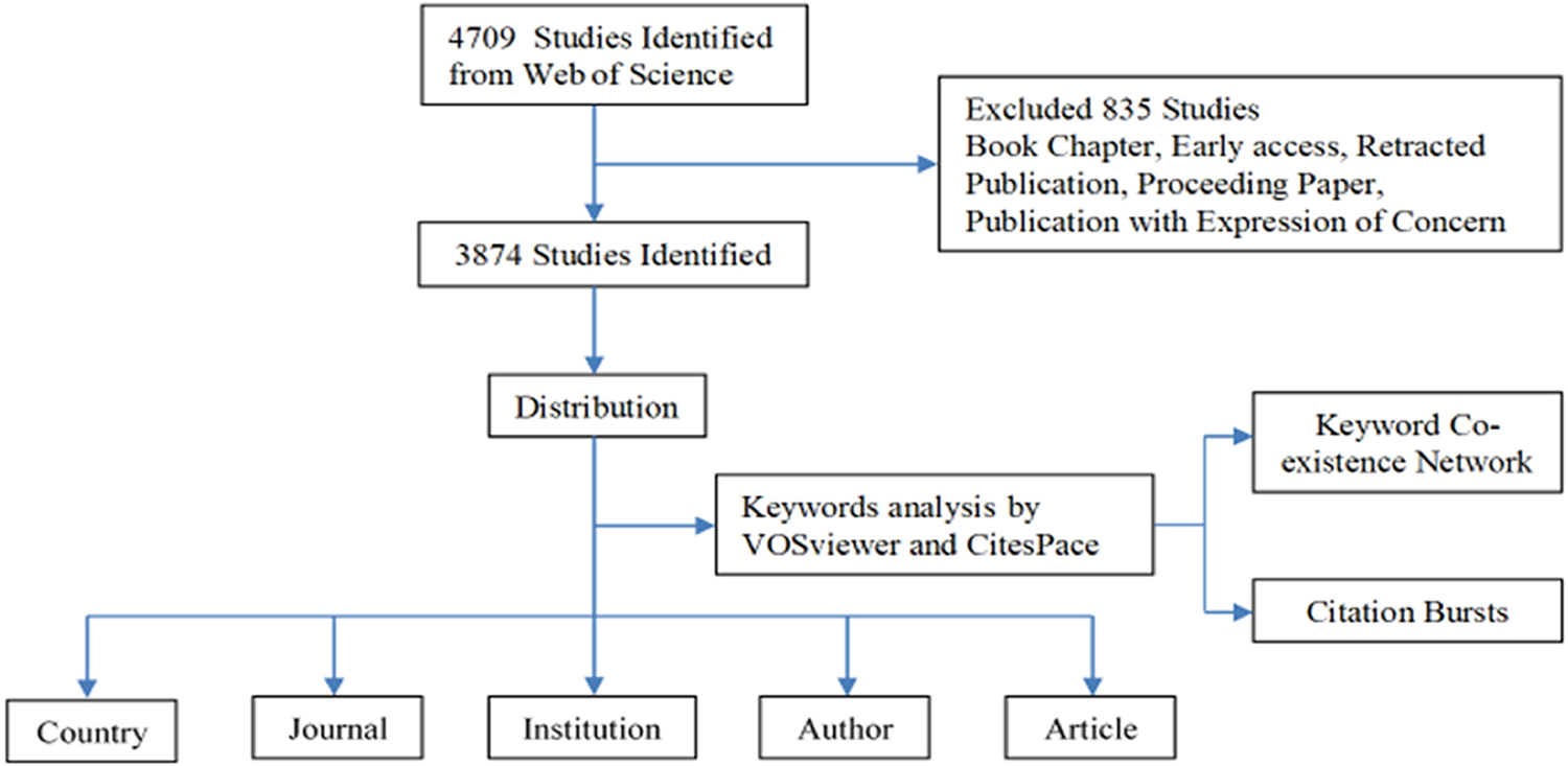 Using VOSviewer, clustering analyses of nodes representing various countries/regions, journals, authors, and keywords were performed based on their occurrence in the download data. The circle's color, size, and connecting lines were used to describe the frequency and links of nodes. Moreover, analyses on countries/regions, journals, and keyword citation bursts were also performed by CiteSpace. The betweenness centrality refers to the core position of the nodes. The strength indicates the connection tightness between object data. The time distribution of keywords is described by beginning and end times.