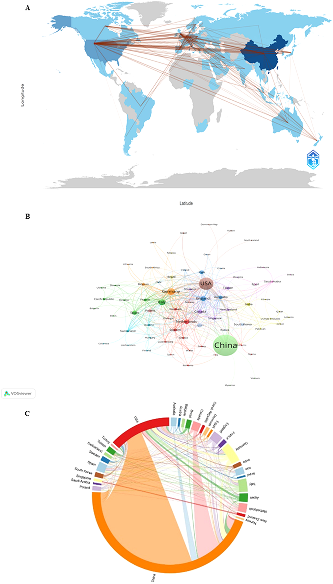 Analysis of country/region network in the "miRNAs in HD" research. (A) Countries/regions collaboration map in R software. (B) Collaborative network visualization of countries/regions in VOSviewer. The figure shows the countries/regions distribution of miRNA-related literature on heart disease. The size of the nodes indicates their literature quantity. The number of connecting lines is positively proportional to the closeness between different countries/regions. (C) Collaborative network visualization of countries/regions in VOSviewer.