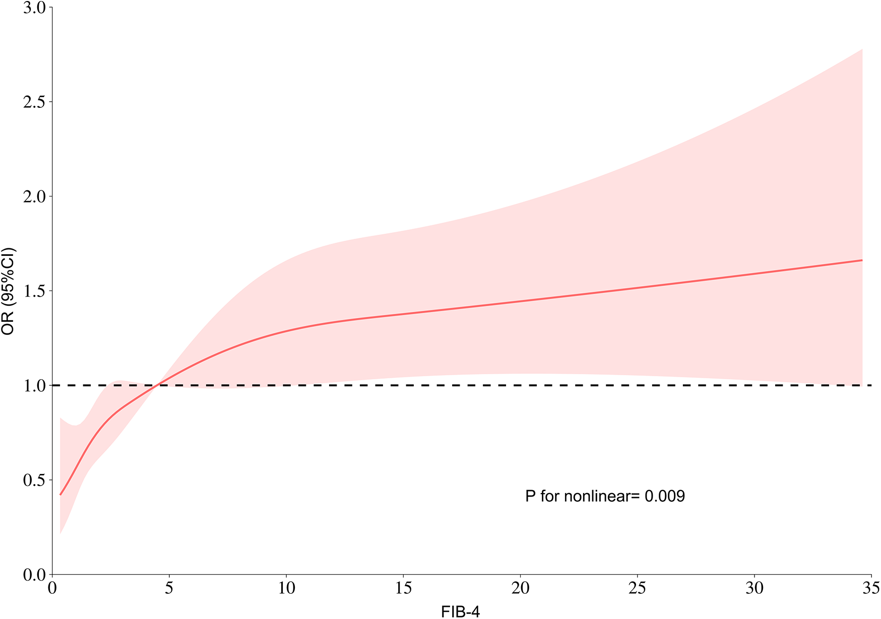 It is noteworthy that the odds ratio is higher in patients without diabetes compared to those with diabetes. As illustrated in Figure 5, the association between FIB-4 and LVA does not reach statistical significance among diabetic patients (P = 0.122), likely due to the small number of participants with diabetes (N = 403). This limitation may also explain the elevated odds ratio found in non-diabetic patients relative to those with diabetes. It is plausible that, with a sufficiently large sample size, the odds ratio for the diabetic population could surpass that of the non-diabetic group.