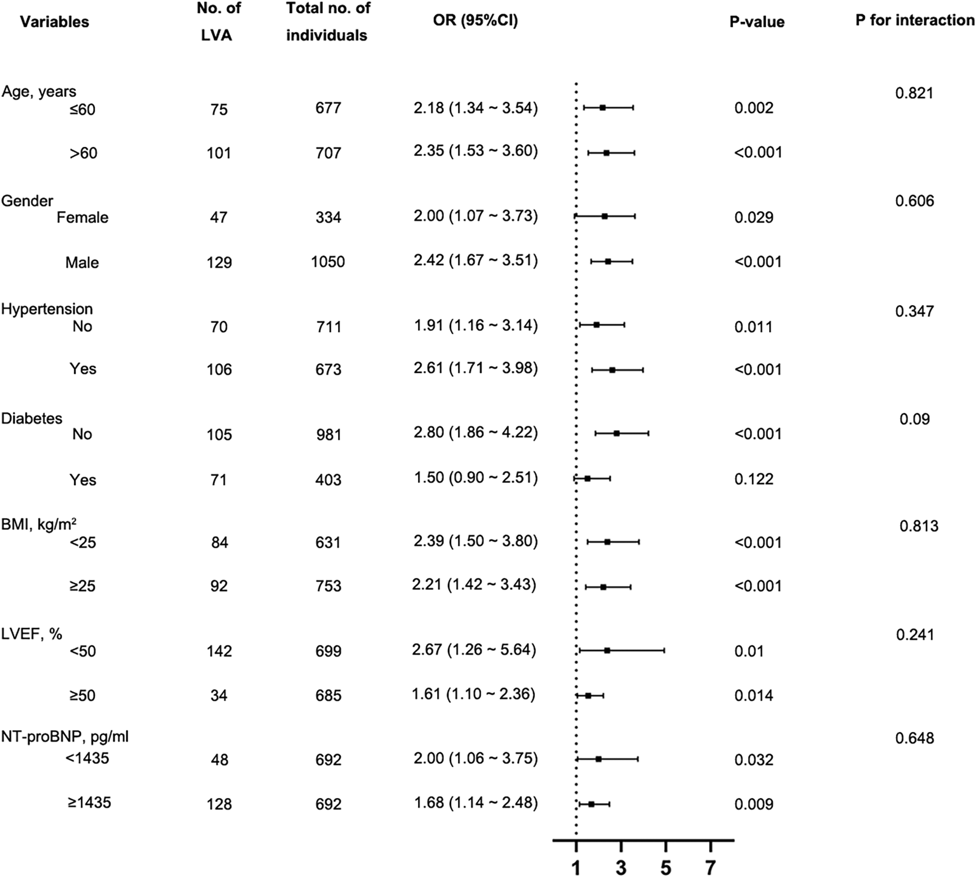 Subgroup analysis using forest plots to assess the connection between the FIB-4 index and the likelihood of LVA formation. FIB-4, fibrosis-4; LVA, left ventricular aneurysm; LVEF, left ventricular ejection fraction; BMI, Body Mass Index; NT-proBNP, N-terminal pro-B-type natriuretic peptide; OR, Odds Ratio.