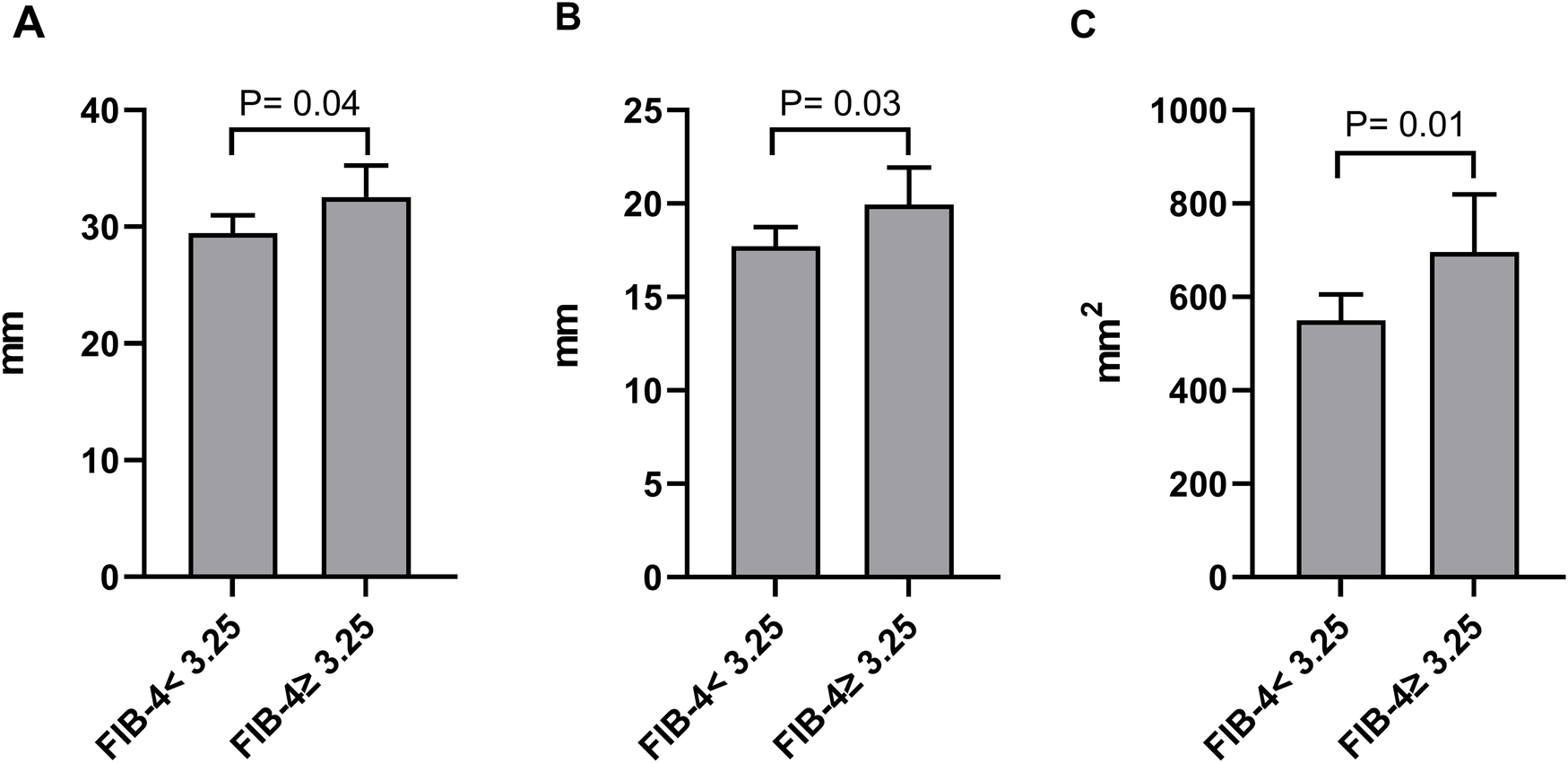 Comparison of the maximal length (A), maximal width (B), and product of length and width (C) of LVA between patients grouped by FIB-4 index.